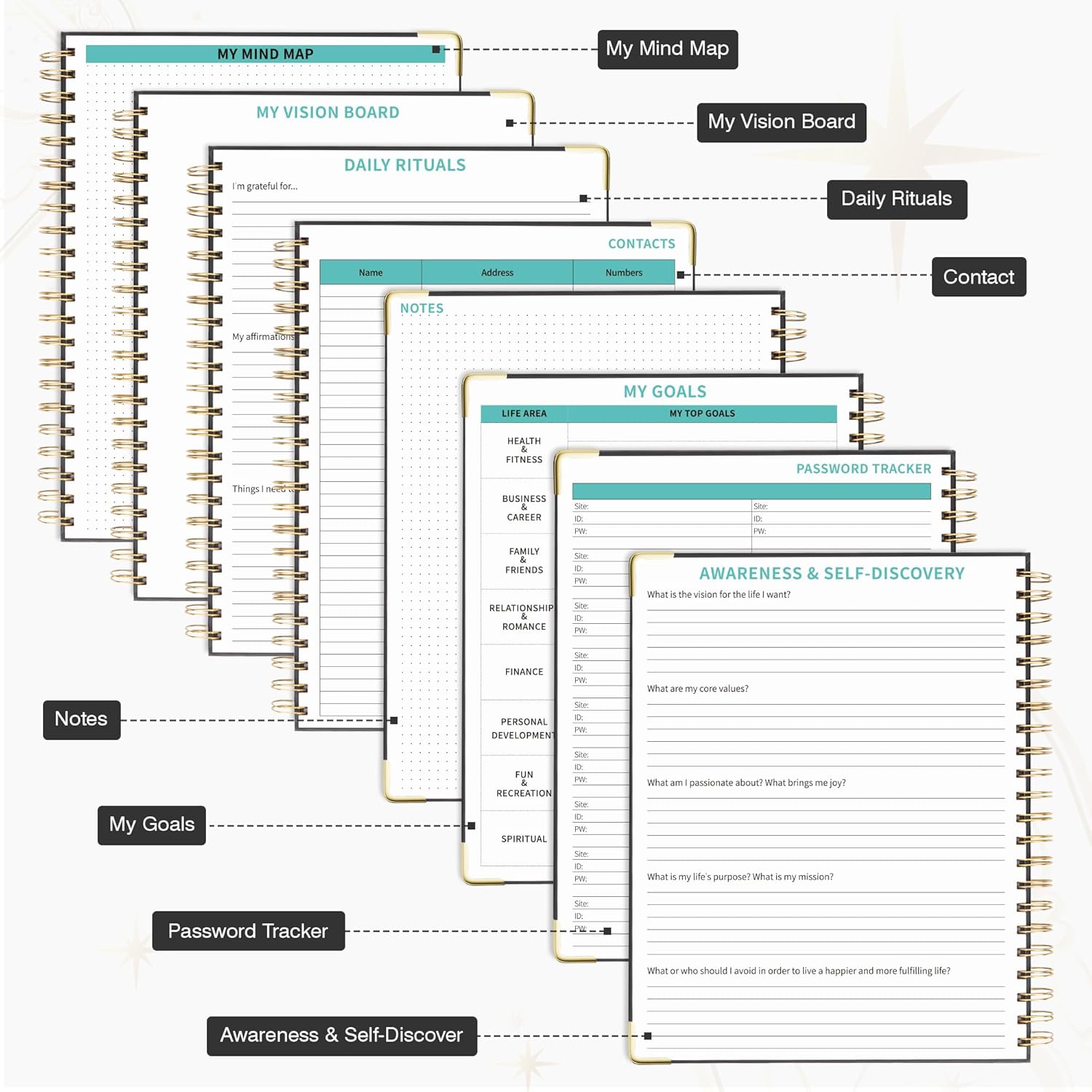 - Undated Clear Layout: With 12 blank months and 53 weeks, a 7 AM to 8 PM daily schedule section, and additional sections for contacts, passwords, awareness and self-discovery, daily rituals, goals, and notes, this life planner offers the freedom to plan your schedules at any time.