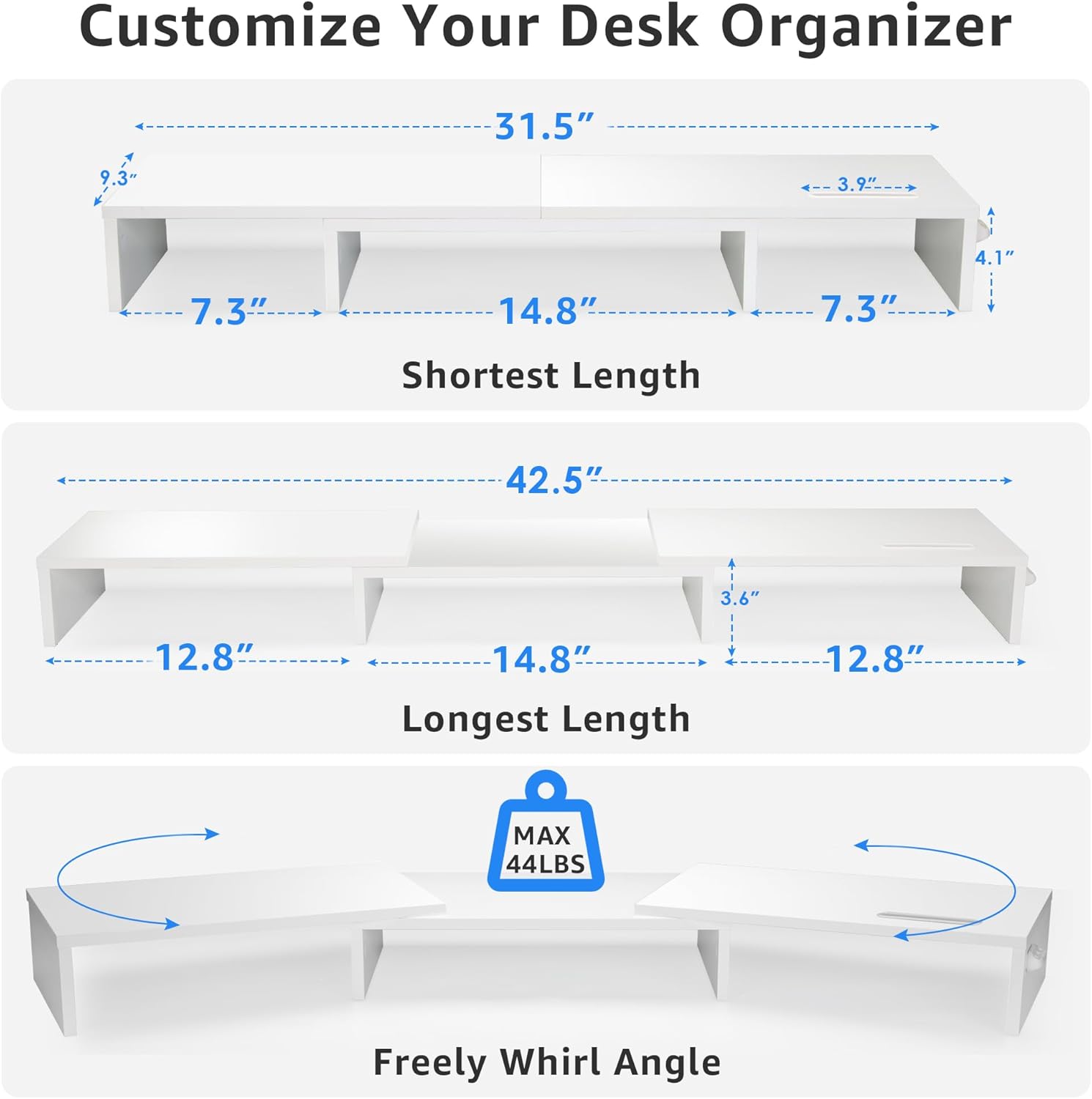 - Simple Assembly: You can put it together in just three minutes. Simply use screws to connect the base shelves and attach the two side pieces to the center section. The bottom of the dual monitor stand is designed to reduce slipping and protect surfaces from scratches.