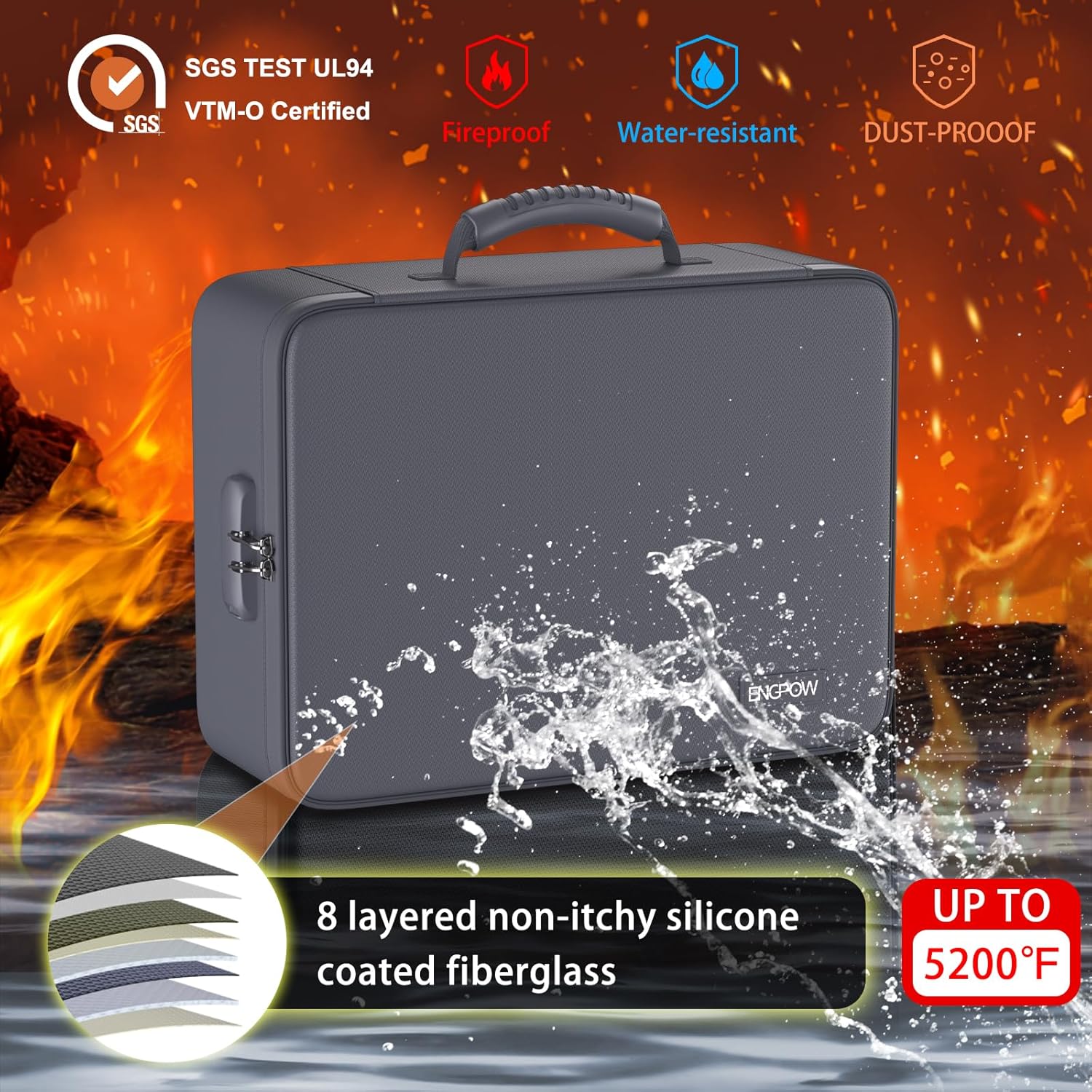 - Fireproof and Water-resistant: The multi-Layer file organizer is made of silicone coated material and aluminum foil which withstand the temperature up to 5200℉(double safe protection).Aluminum foil lining isn’t easily melt under high temperature after several tests. It has been passed by SGS TEST(UL94 VTM-0 Certified).The bag is fireproof and Water-resistant, which can effectively protect your important documents in a fire,flood,and wet weather. They will further keep your files intact