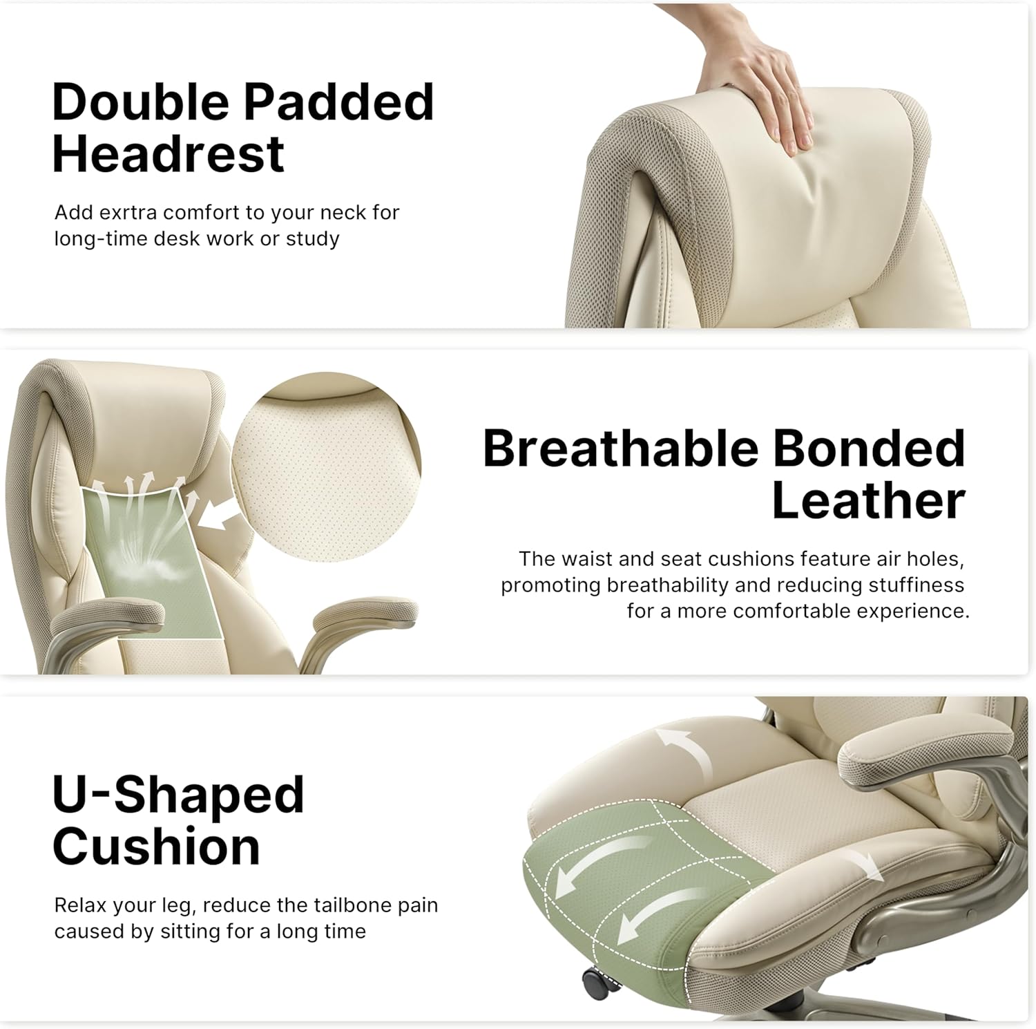 - ăUpgraded PU Leather Desk Chairă Not all leather is created equal. This PU leather used in our specially customized beige executive desk chair is different from beige office chair leather. It is more breathable, more durable, and easier to clean. Our big and tall office chair combine superior comfort and aesthetics, making them the perfect gift choice for yourself or someone you care about.