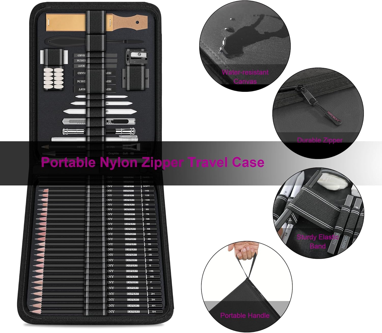 HIFORNY 58 PCS Drawing Kit Sketching Pencil Set,Sketch Pencils Art Supplies with 3-Color Sketchbook,Graphite,Charcoal,Blending Tools,Drawing Pencils for Adults Artists