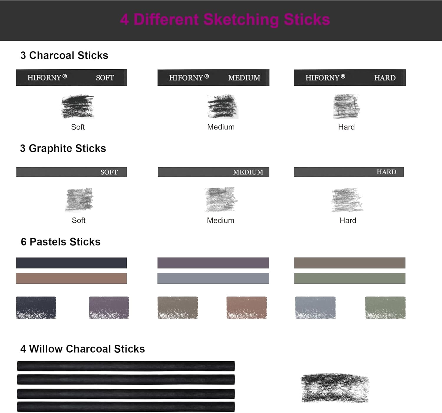 - 【Complete Drawing Pencils for Sketching】HIFORNY 126 pcs sketching & drawing set includes 24 premium sharpened graphite pencils(14B,12B,10B,9B,8B,7B,6B×2 ,5B,4B×2,3B,2B×3,B,HB×2,F,H,2H,3H,4H,5H),24 colored charcoal pencils,3 black charcoal pencils(soft,medium,hard),3 white charcoal pencils(soft,medium,hard),3 woodless graphite pencils(2B,4B,6B),3 graphite and 3 charcoal sticks,6 pastels sticks,4 willow charcoal sticks,3 gel pen(white/gold/silver),1 eraser pencil with brush,1 marker pen,1 dotting pen.Each pencil is marked with name and model,perfect for drawing,sketching,shading,layering,blending,and more.