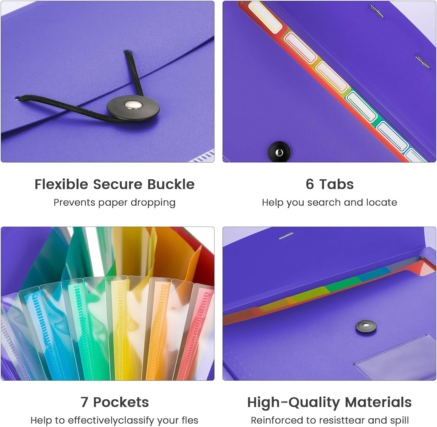 Accordion File Organizer, 7 Pockets Expanding File Folder with Labels, A4/Letter Size Portable Folders for Documents, Paper Organizer for School Office Supplies, Purple Blue
