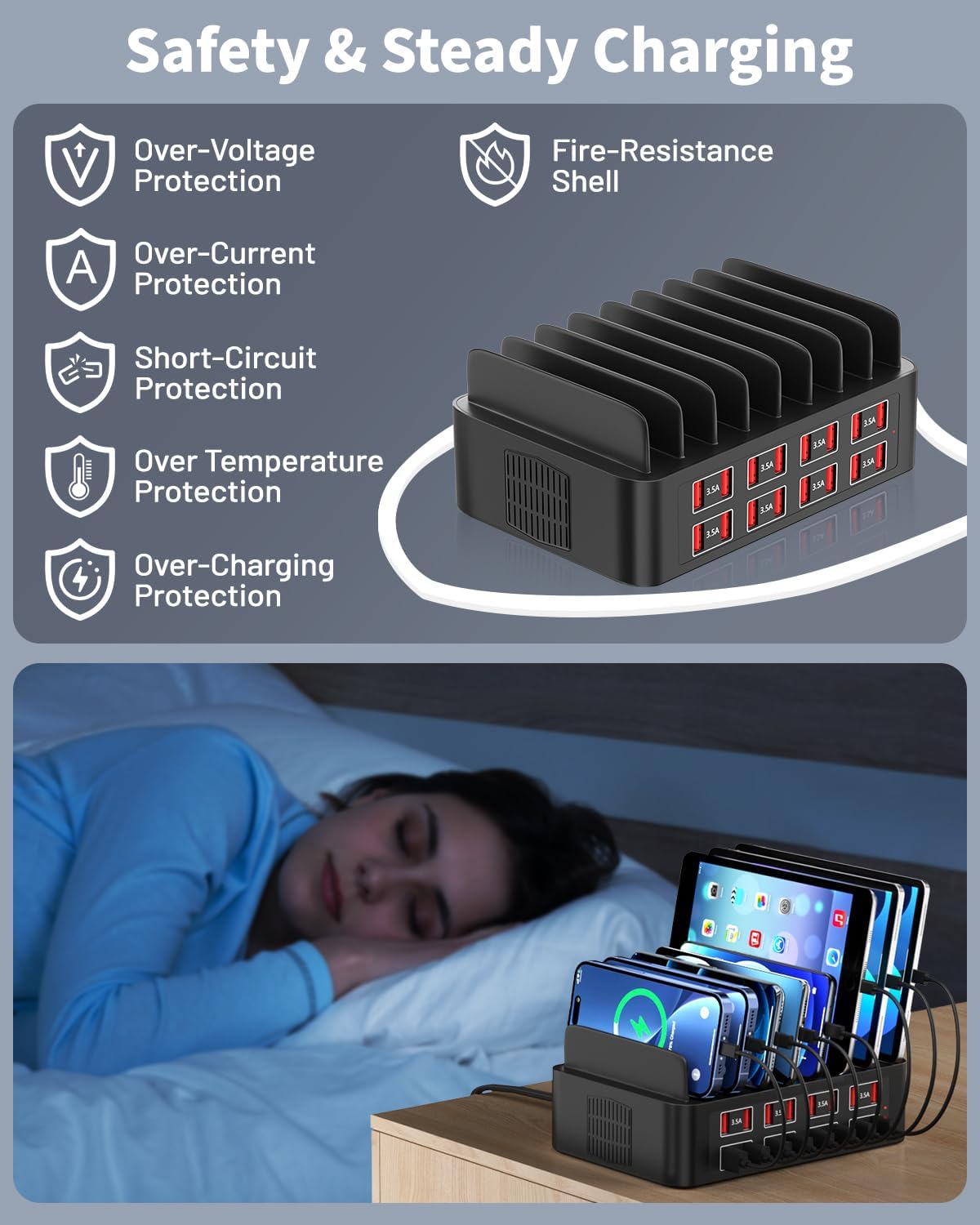 - Safe & Smart Technology: Built-in advanced safety features like surge protection, temperature control, and short-circuit prevention ensure that your multiple devices are charged safely every time, protecting both your gadgets and your peace of mind