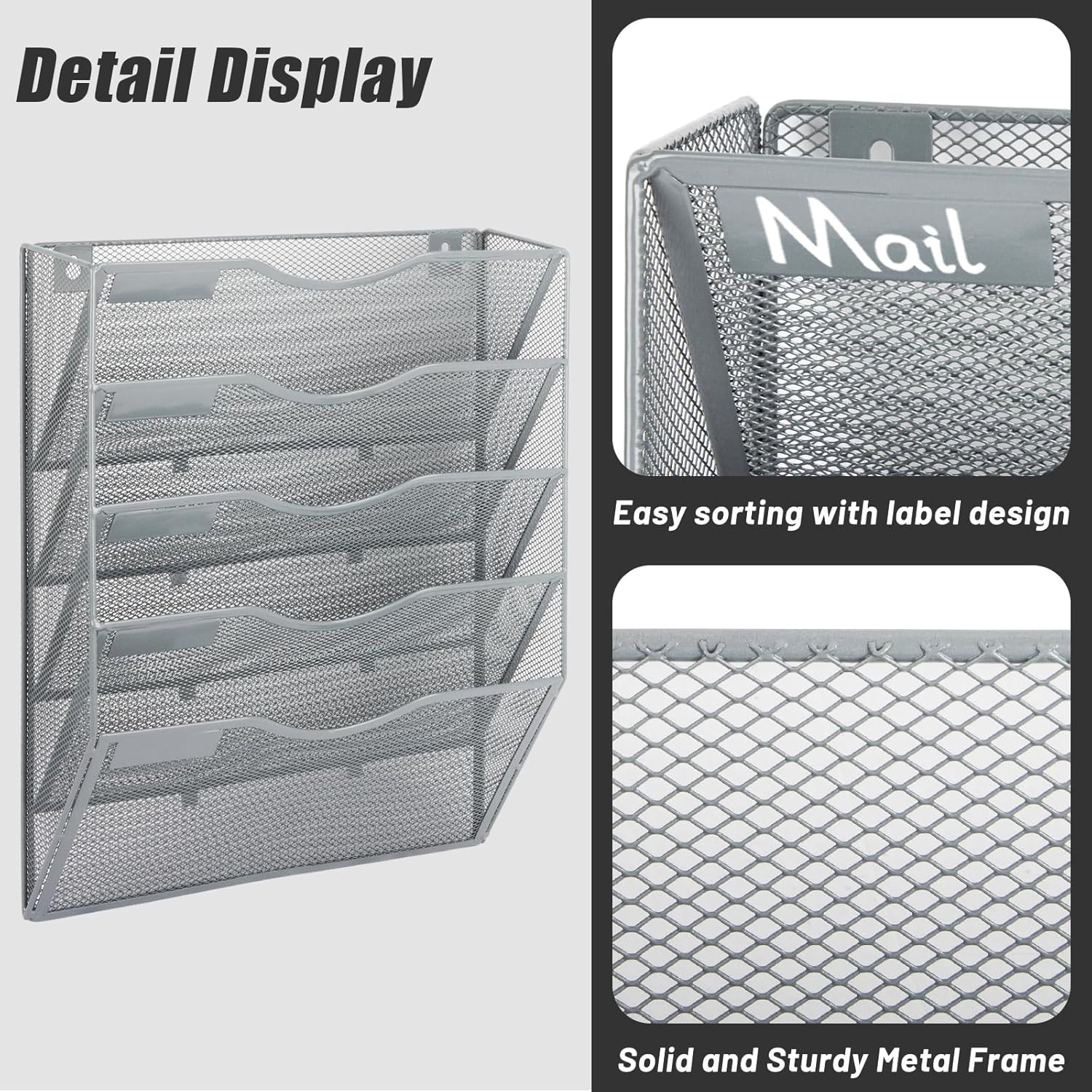 EASEPRES 5 Pocket Mesh Hanging Wall File Organizer, Wall Mounted Mail Paper Document Folder Holder, Clipboard Storage Organization Magazine Rack with Nametag Label for Office Home School, Gray