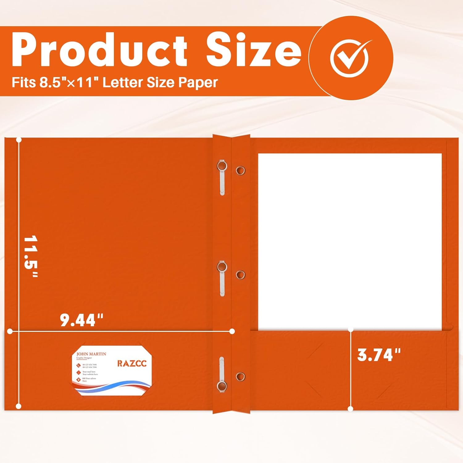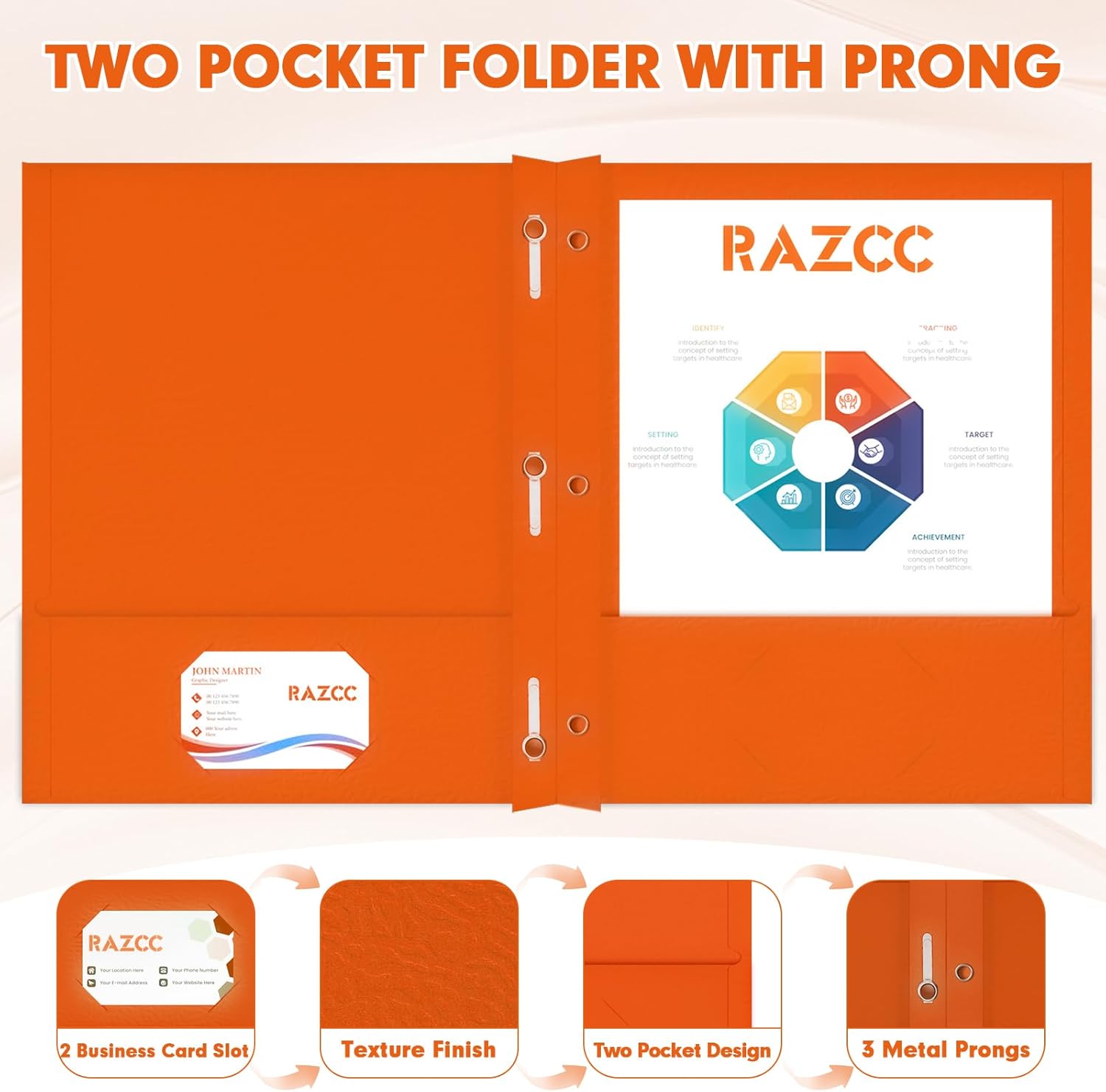 - TWO POCKET FOLDER SET: 75 Pack of orange folders, each folder with 2 inner pocket, 3 prongs and 2 business card slots. Crafted from texture and heavyweight paper stock, not easy to break and deform