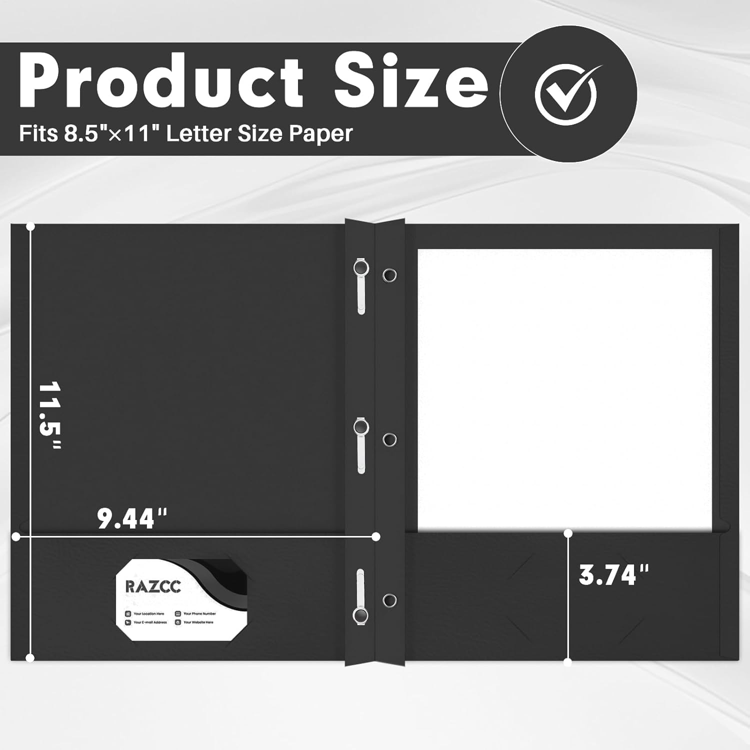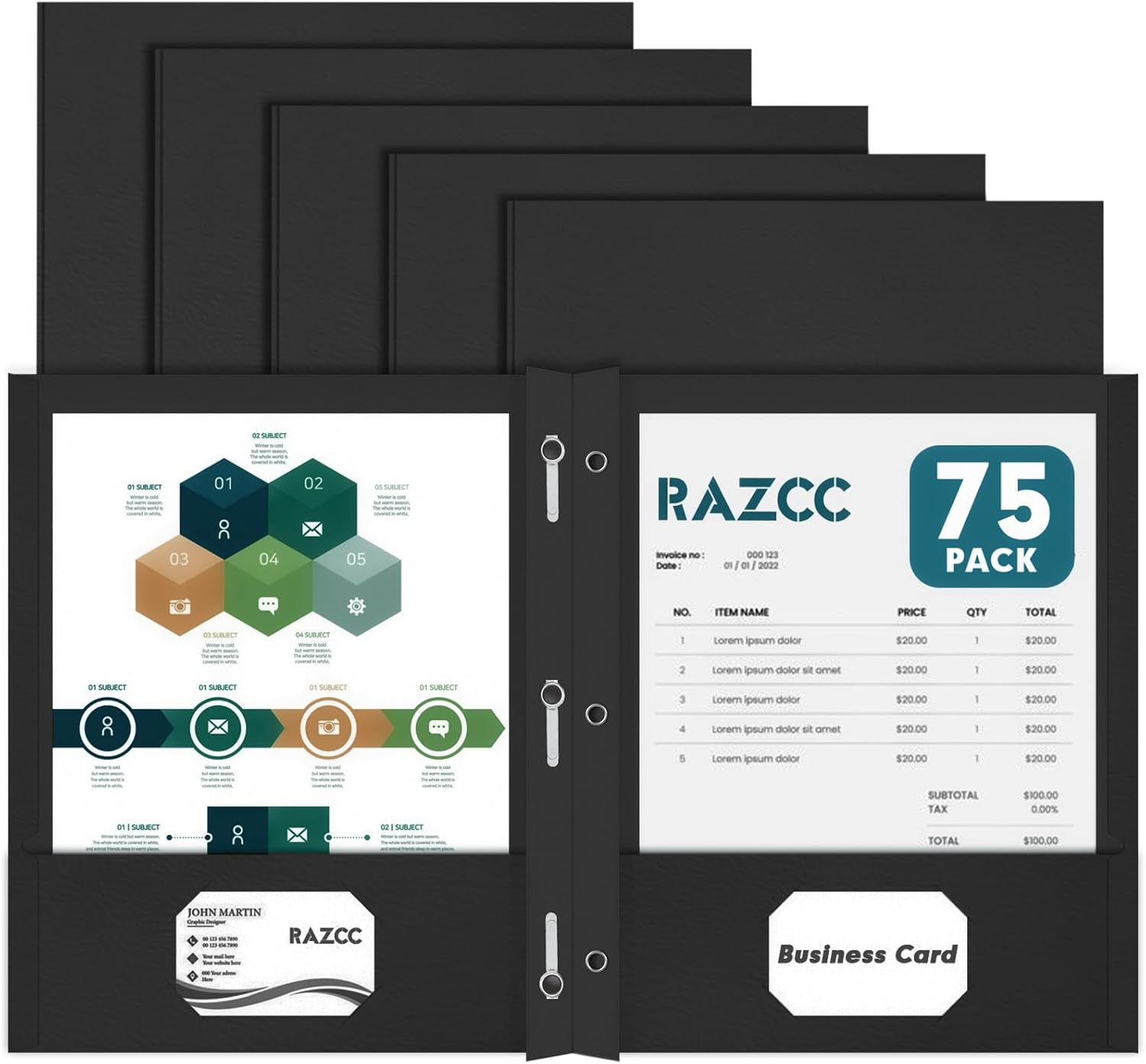 - TWO POCKET FOLDER SET: 75 Pack of black folders, each folder with 2 inner pocket, 3 prongs and 2 business card slots. Crafted from texture and heavyweight paper stock, not easy to break and deform