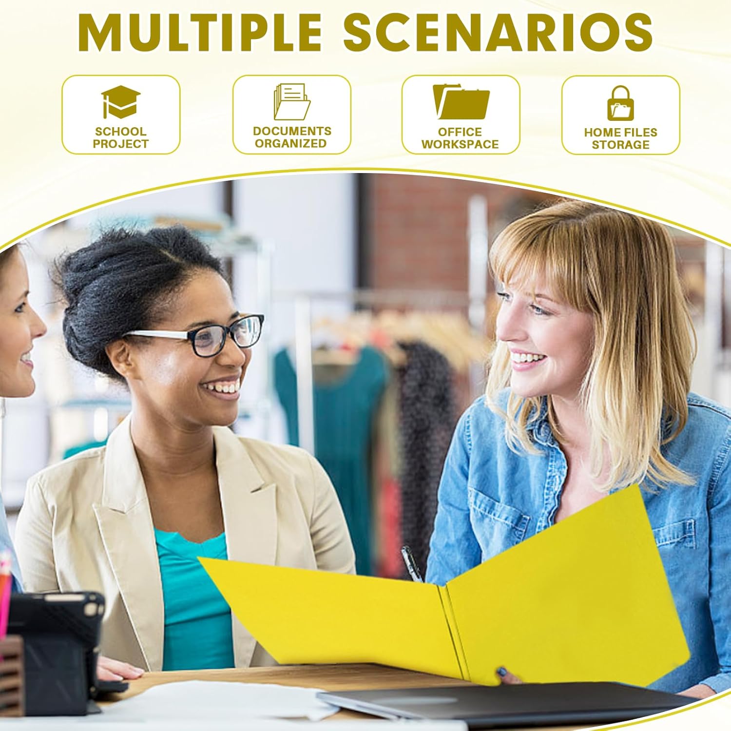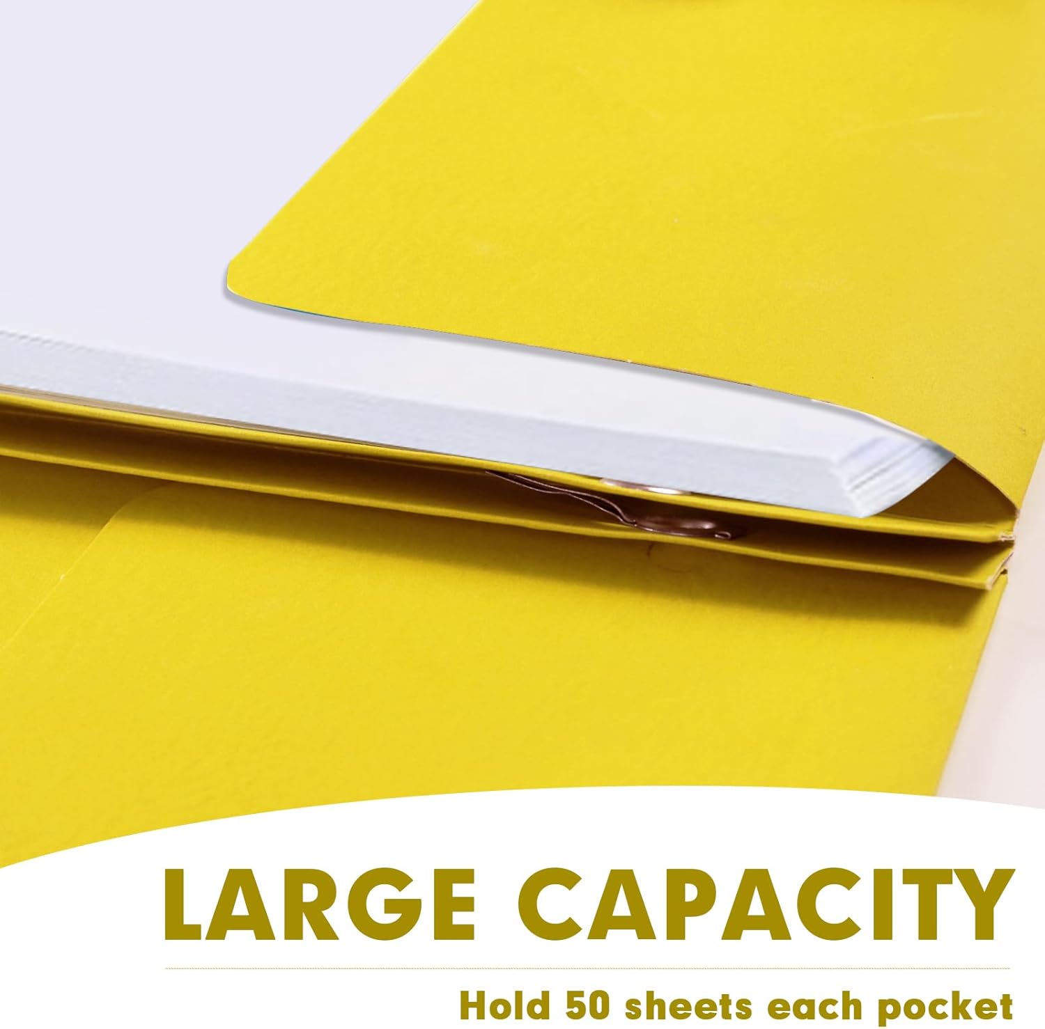 - TWO POCKET FOLDER SET: 75 Pack of yellow folders, each folder with 2 inner pocket, 3 prongs and 2 business card slots. Crafted from texture and heavyweight paper stock, not easy to break and deform