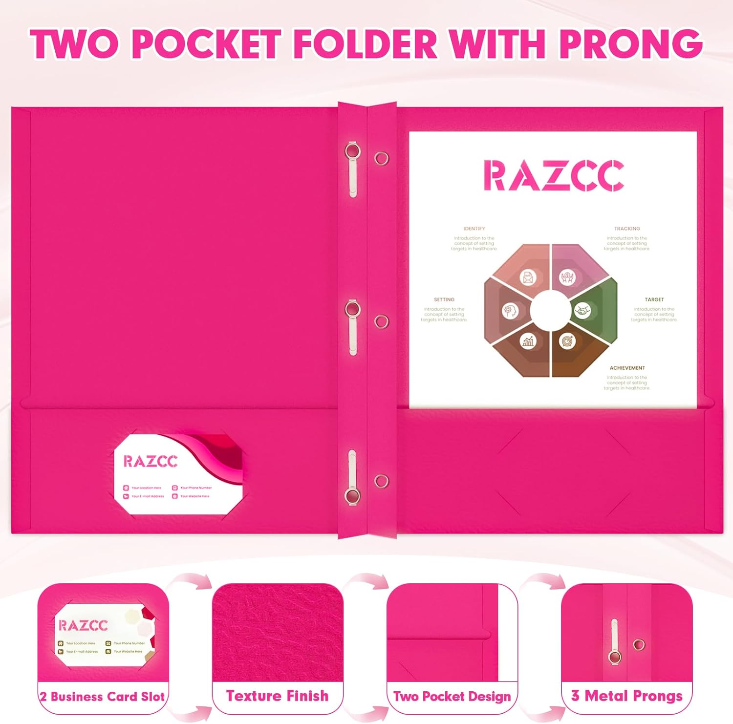 - TWO POCKET FOLDER SET: 75 Pack magenta folders, each folder with 2 inner pocket, 3 prongs and 2 business card slots. Crafted from texture and heavyweight paper stock, not easy to break and deform