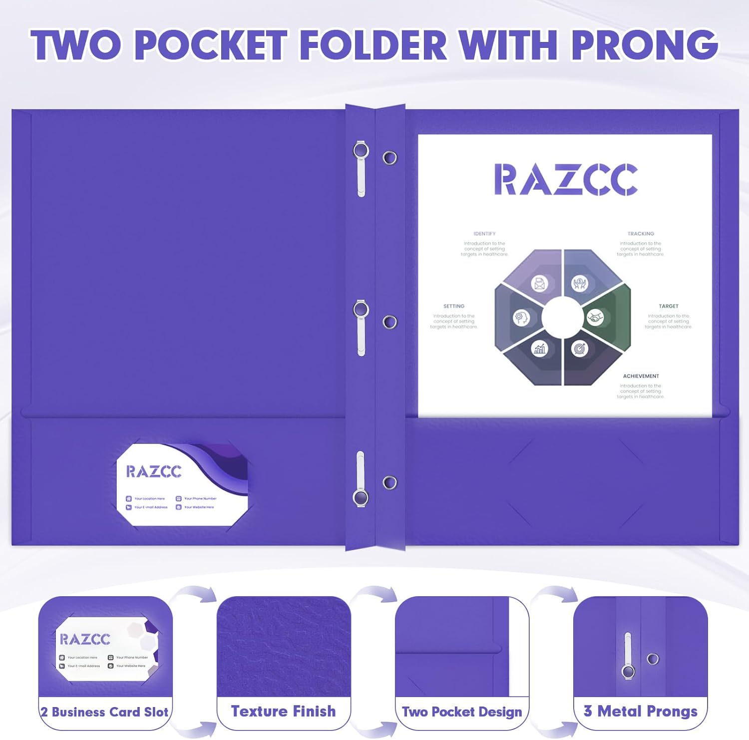 - TWO POCKET FOLDER SET: 75 Pack of purple folders, each folder with 2 inner pocket, 3 prongs and 2 business card slots. Crafted from texture and heavyweight paper stock, not easy to break and deform