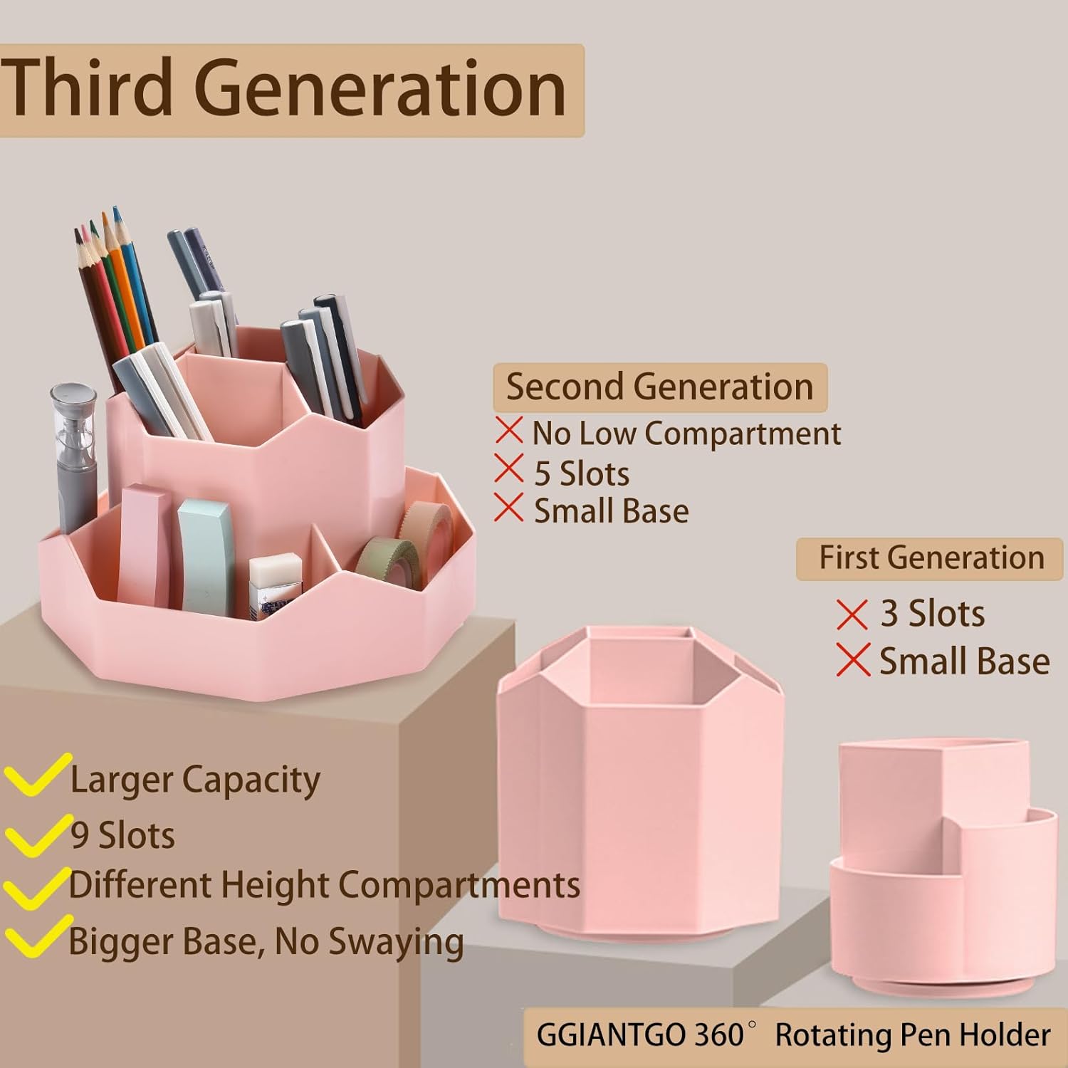 Pencil Pen Holder for Desk, 9 Slots 360 Degree Rotating Desk Organizer, Cute Pen Organizers Stationery Supplies for Office Home & Art Supply (Pink)