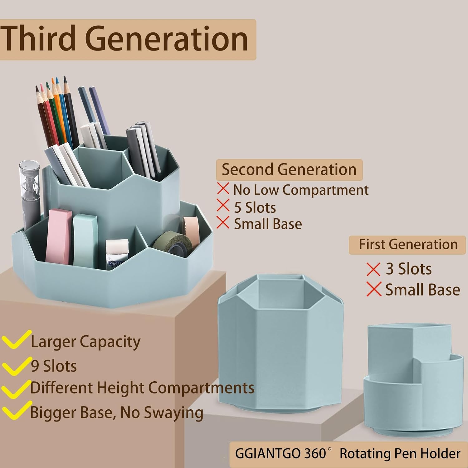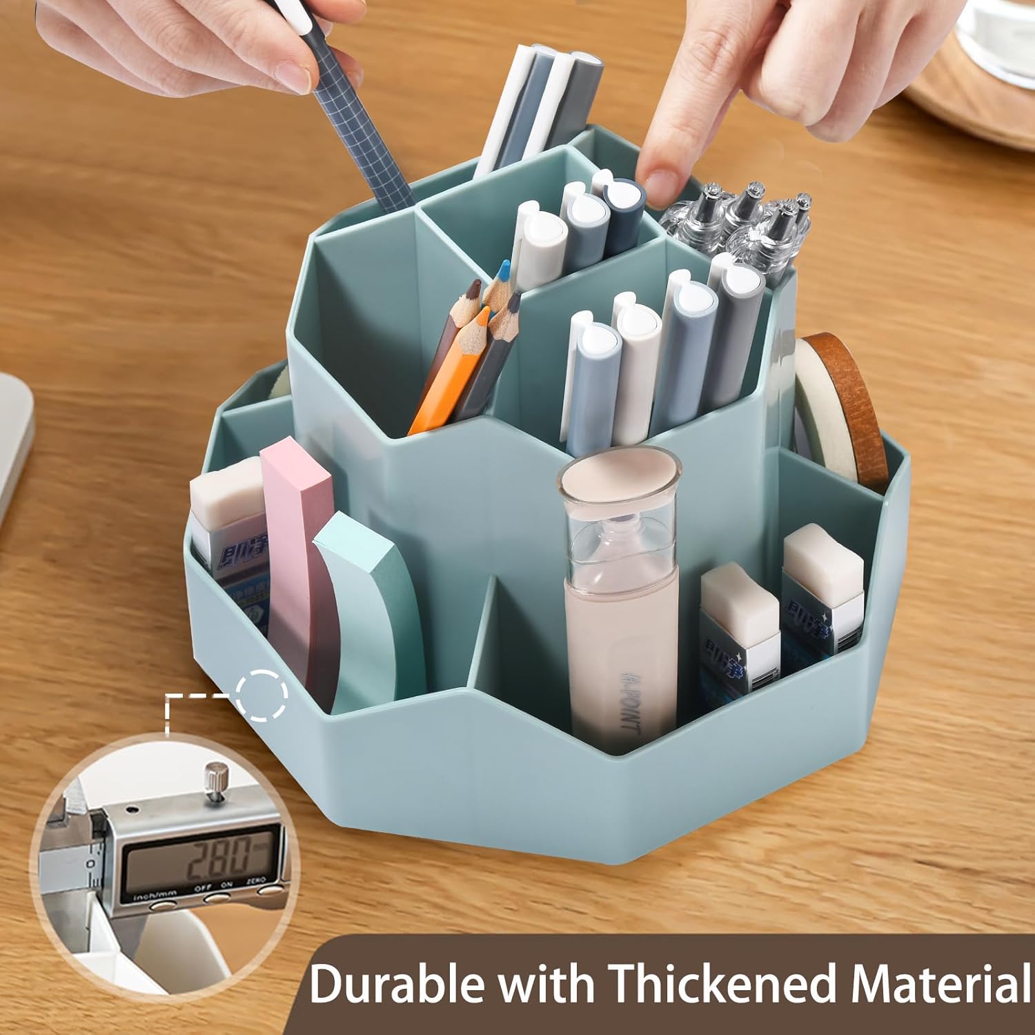 - ă360 Degree Revolving DesignăThis pen organizer for desk can be turned up to 360-degree rotation. It spins smoothly all around without getting stuck. Easy to access, easy to get from any angle, always keep your desk tidy and organized.