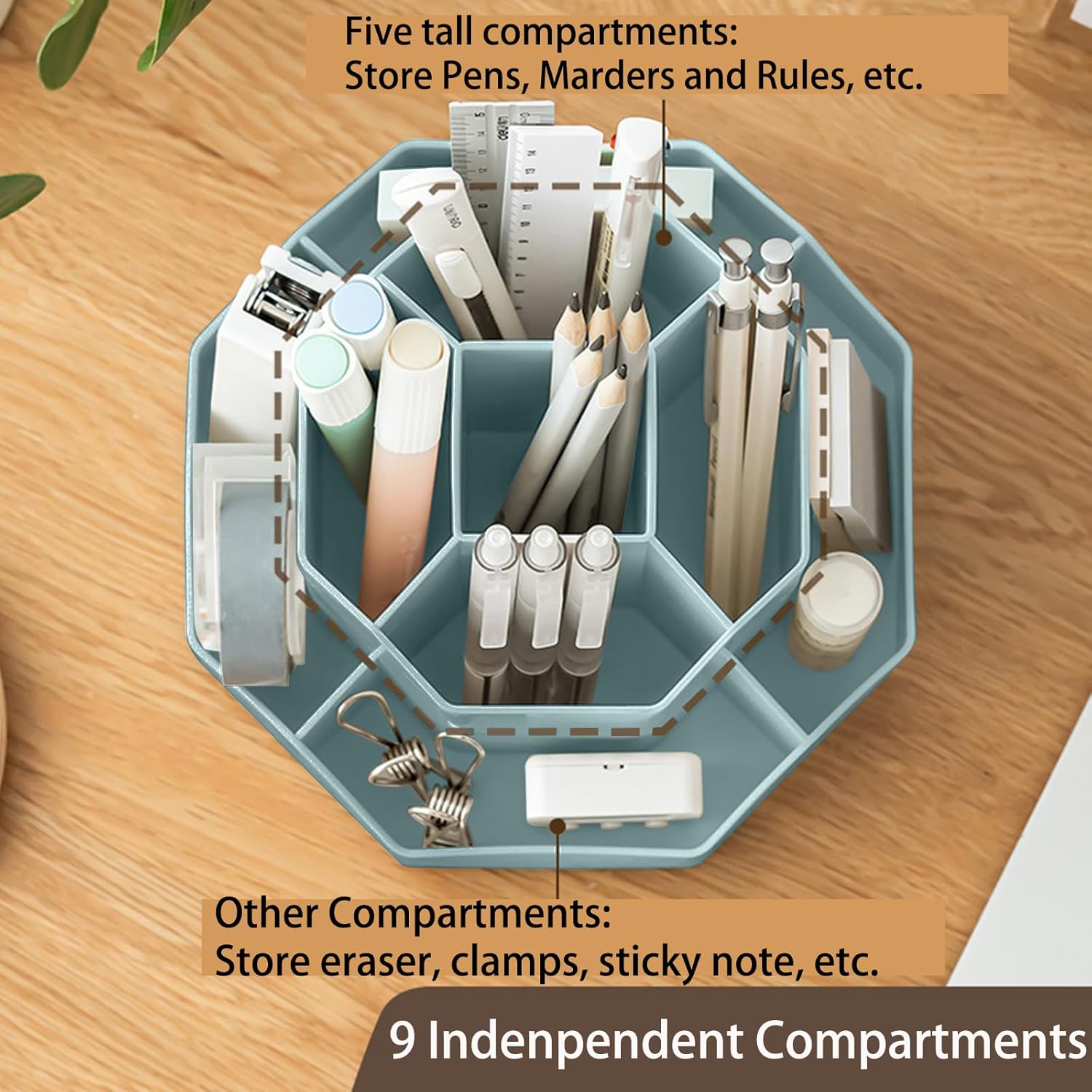- ă9 Independent Compartments DesignăThis pencil organizer has 9 divided compartments with different spaces and heights to meet your needs, makes it easy to hold and sort pencils, pens, rulers, scissors, pencil knife, etc. Save your time searching for different pens.