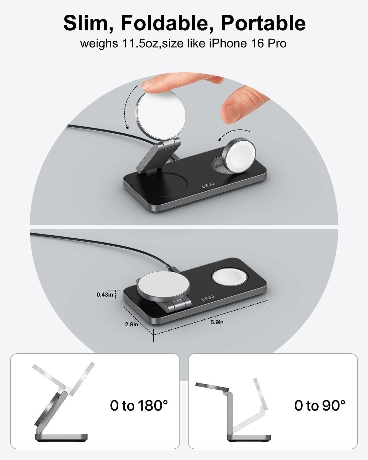 - 【Adjustable and Space-Saving】 Featuring a foldable, slim, space-efficient design with angle-adjustable phone and watch charging modules,this mag-safe charging station allows you to find better viewing angle. Also this foldable charger’s compact size makes it perfect as travel charger. The stable heavy base and anti-slip bottom pad ensures you can remove your iPhone with one hand without it tipping over. Ingenious structure design makes it won’t block your iPhone’s camera while charging.