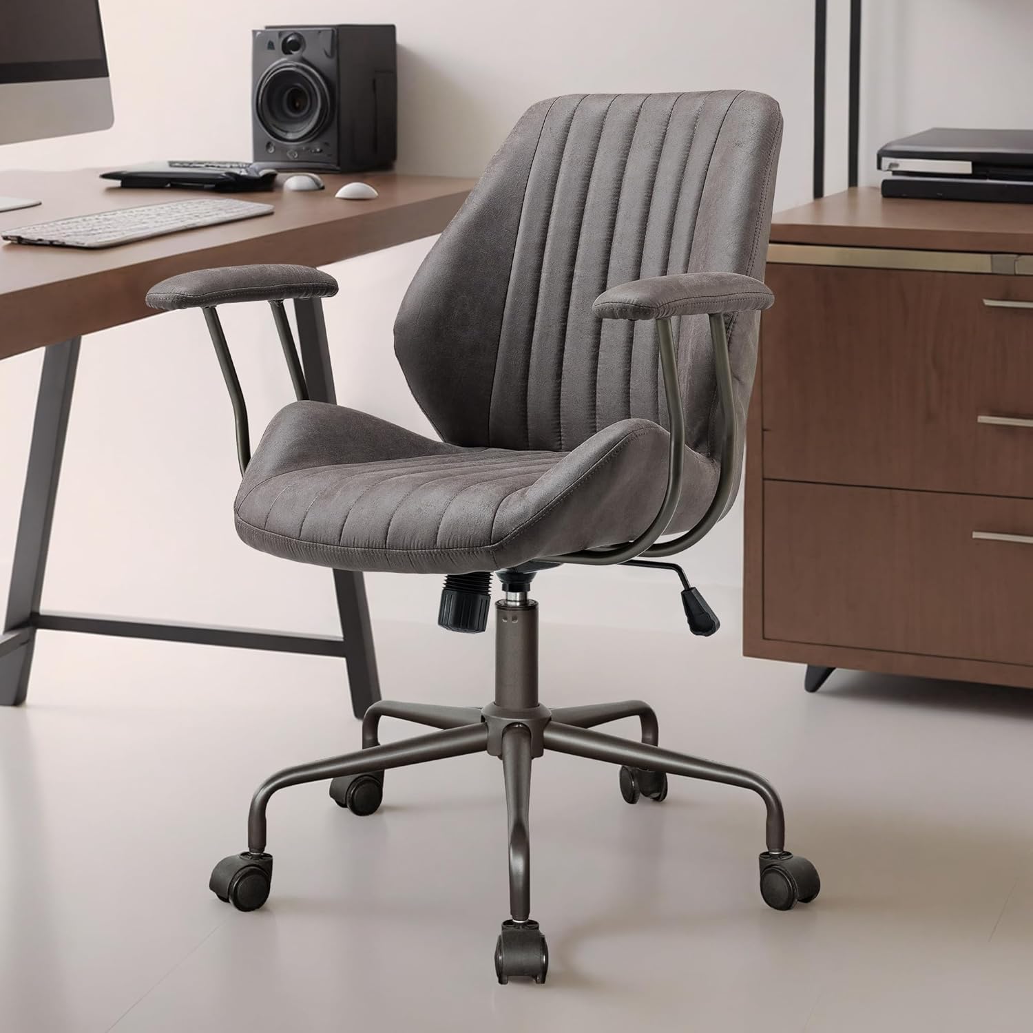 Mid Century Modren Office Chair - Mid Back Swivel Executive Chair with Lumbar Support,Ergonomic Computer Desk Chair with Wheels,Faux Lether Suede Task Chair,350lbs (Grey, Mid Back)