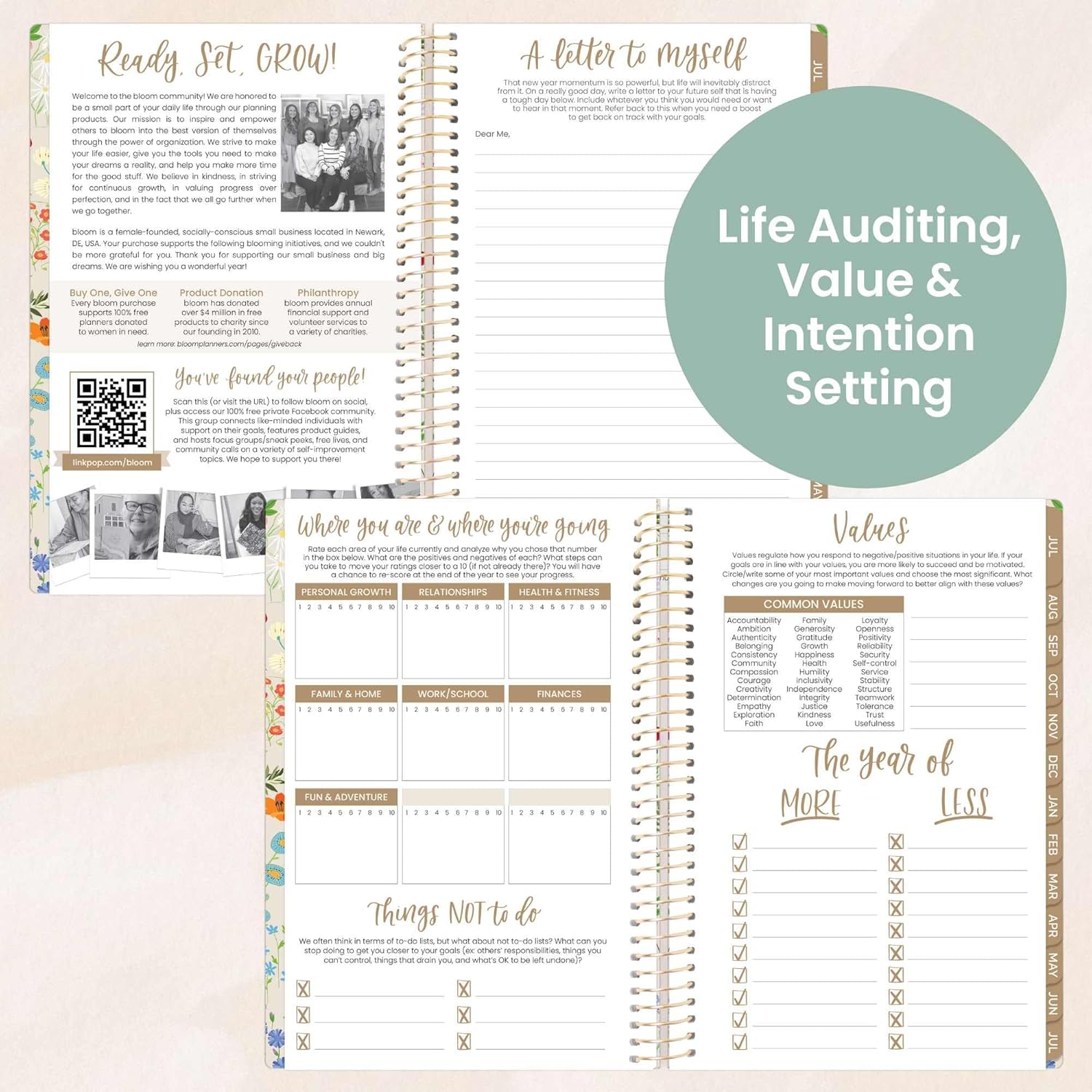 - BONUS: Packed with life coaching worksheets and inspirational features to help you set and achieve all of your goals for the year: personal mission statement prompt and yearly goal setting page, weekly scheduling templates, values page, habit tracking, vision board, monthly spending log, 13 notes pages, inspirational quotes, monthly challenges, and more!