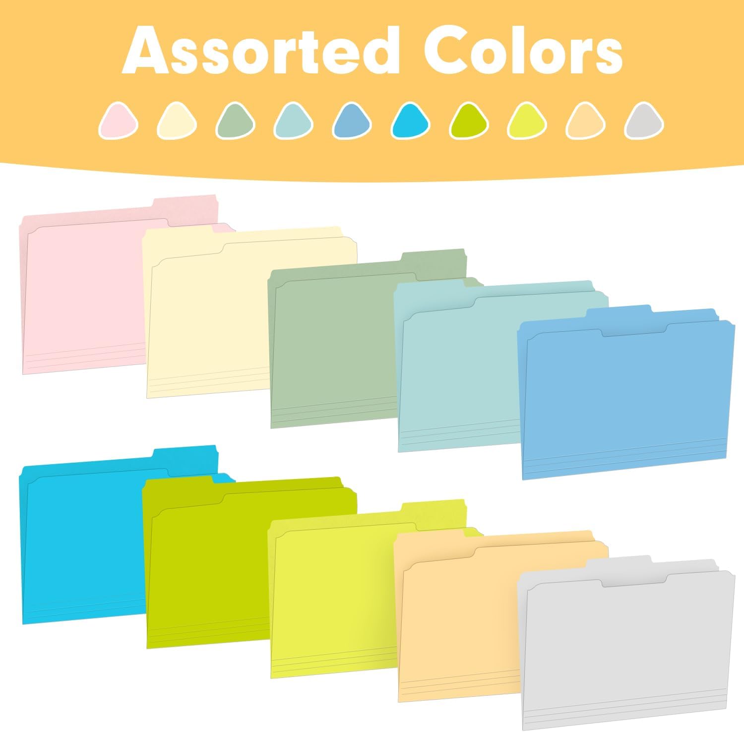 - ASSORTED COLORS: These Folders with a vibrant selection of 10 colors, to make color-coded, for better sorting and classifying, organizing your documents effortlessly and speed filing and retrieval times