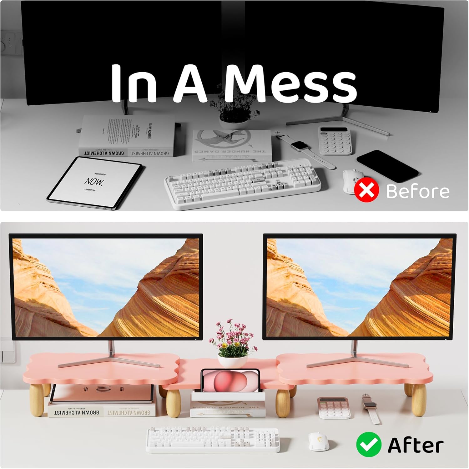 Dual Monitor Riser - Cookie-Shaped Adjustable Length & Swivel Angle, Wooden Desktop Organizer for 2 Monitors, Stand With Drawer for Laptop, PC, Computer, Printer, Pink