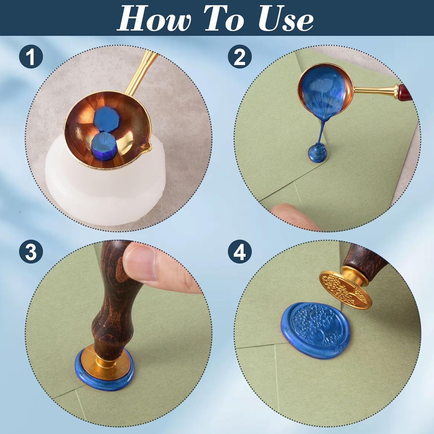 - Package Includes: You will get 1 set of gold wax seal stamp, which includes 1pcs wooden handle + 4pcs wax seal stamps with different shape.