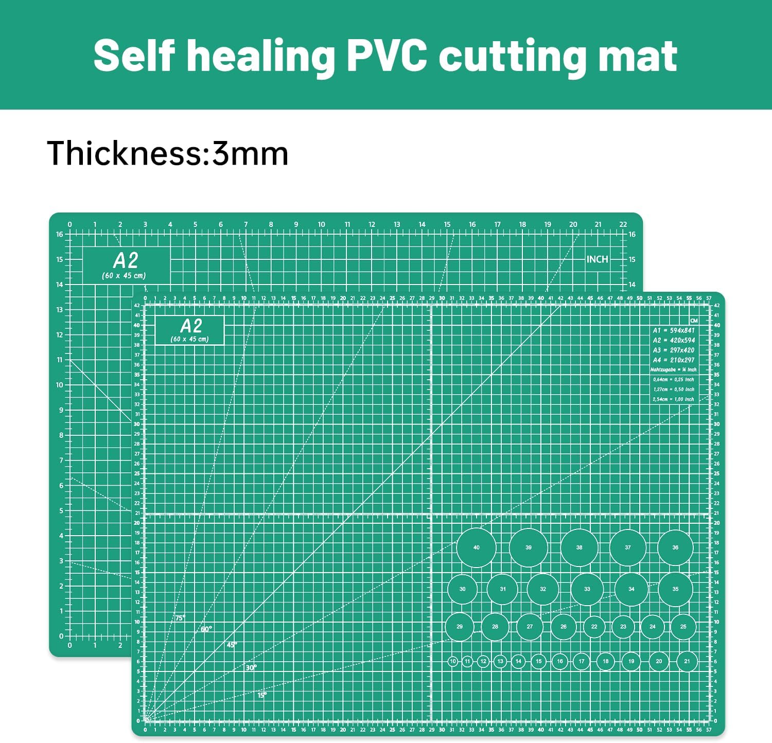 - MAT SIZE: 18 x 24 inches (A2), Double sided(metric&inch), thickness 3 MM. Perfect for small and medium craft and sewing projects.Ideal for as a craft cutting board to use with rotary or straight-edge blades. A great gift choice for any quilters or hobbyists to add to their sewing accessories and quilting supplies!