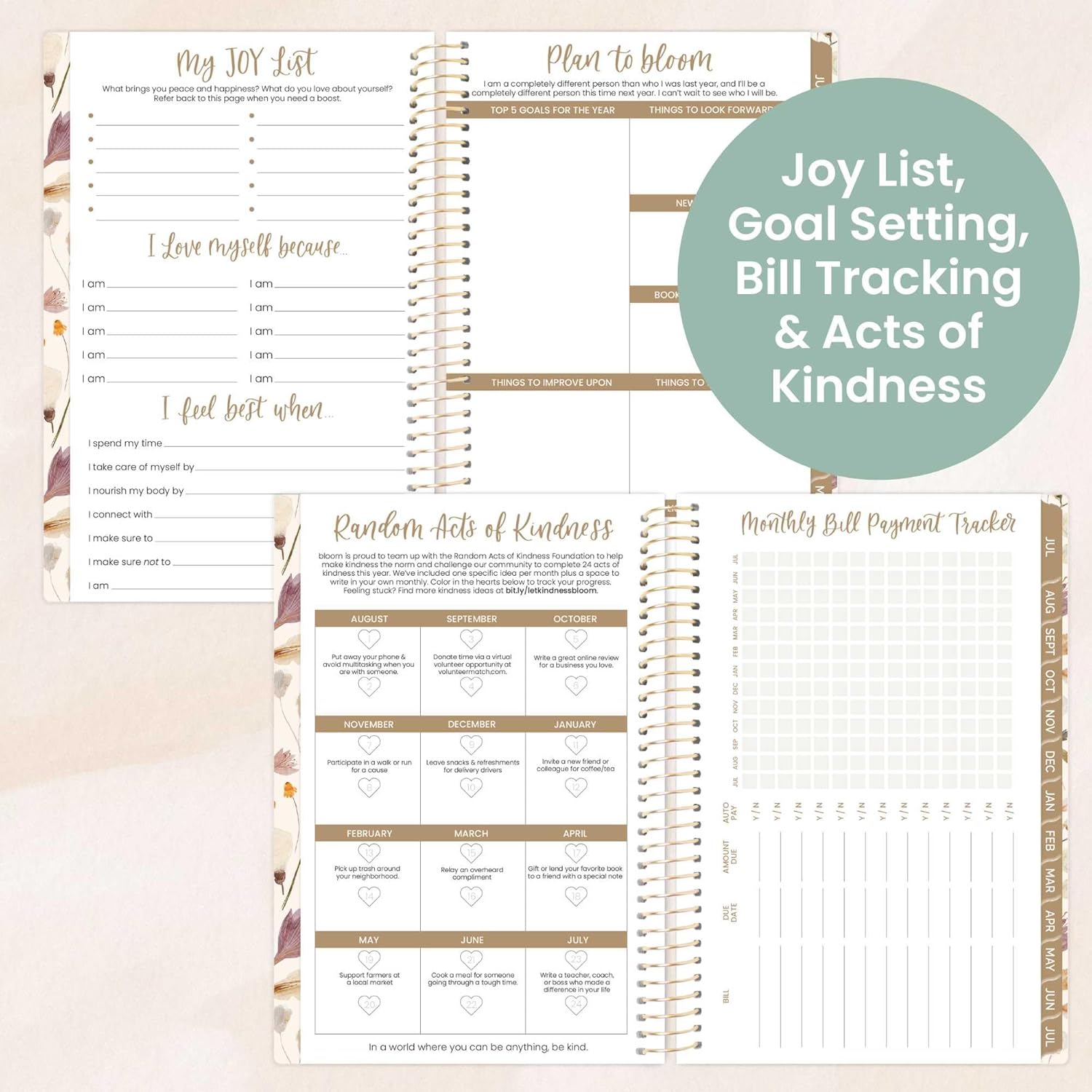 - BONUS: Packed with life coaching worksheets and inspirational features to help you set and achieve all of your goals for the year: yearly overview, values page, monthly bill tracking, joy & affirmations list, 9 notes pages, important dates for next year, monthly quotes & more!