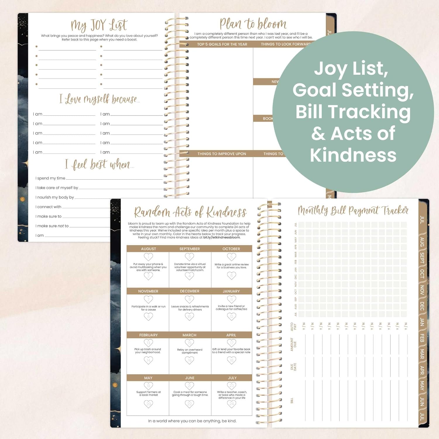 - MORE THAN A PLANNER: In addition to weekly and monthly planning, this appointment book is packed with inspirational worksheets to help you bloom this year: monthly bill tracking, acts of kindness challenges, 9 notes pages, important dates for next year, monthly quotes & more!