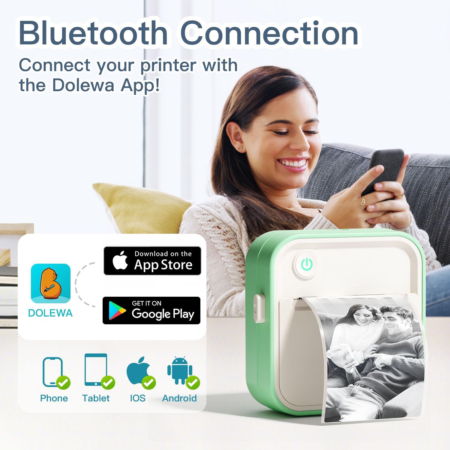 - USER-FRIENDLY: The mini pocket printer is compatible with IOS & Android phones /tablets via bluetooth connection. Fllow the steps: ①Long press for 3 seconds to turn on the portable thermal printer. ②Scan the QR code in the user manual to download the "DOLEWA" APP. ③Turn on bluetooth of your phone/tablet. ④Install the paper roll size as you need. ⑤ Connected the impresora portátil with the APP via bluetooth.⑥Start your printing