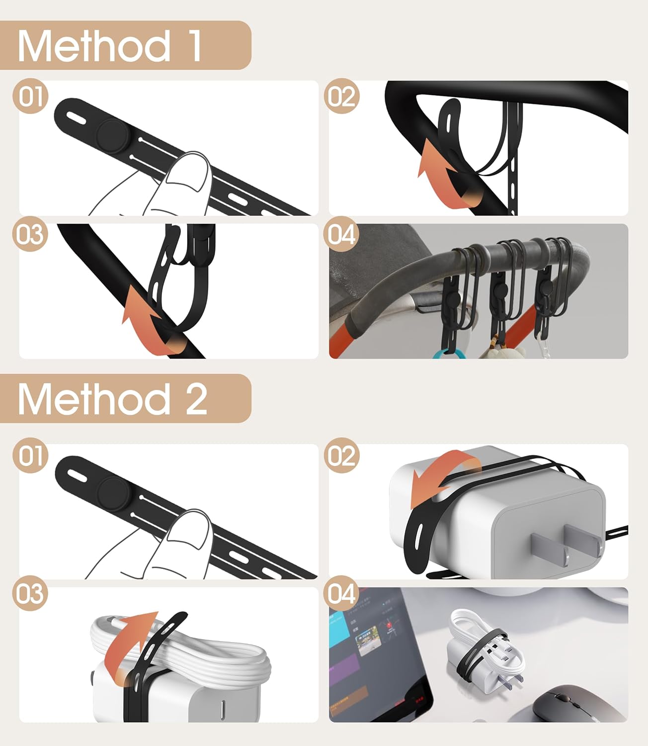 - 【Multifunctional Cable Ties】The design of this double-sided silicone tie with a wide buckle makes the binding more secure. It can not only be used for cable management, but also for storing keys, scissors and other convenient hanging objects at home, and for connecting hats and coats to backpacks when traveling, freeing your hands