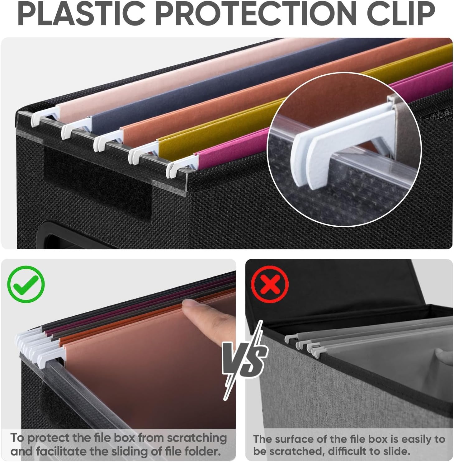 - [UNIVERSAL SIZE] Our file box with lid fits letter-sized files. It is designed for efficiency and functionality, with its smooth PVC slide rails on both sides, you can effortlessly slide file folders for easy access and neatly arranged. The lid fits snugly on the box after hanging folders. (NOTE: file folders are not included)