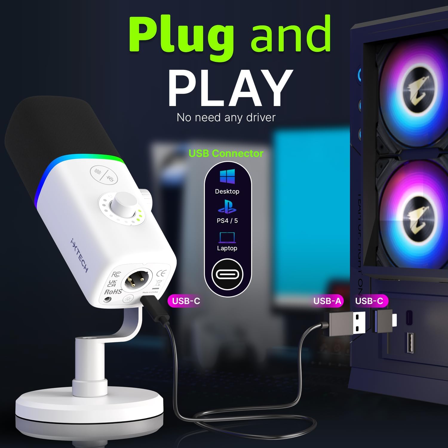 - Plug And Play: Our USB microphone for PC connects to a wide range of devices without any hassles. Compatible with PS4, PS4 Pro, PS5, Desktop PCs, Macs, Laptops, and more through the included USB C cable. Just plug, play, and enjoy! (Not compatible with Xbox)