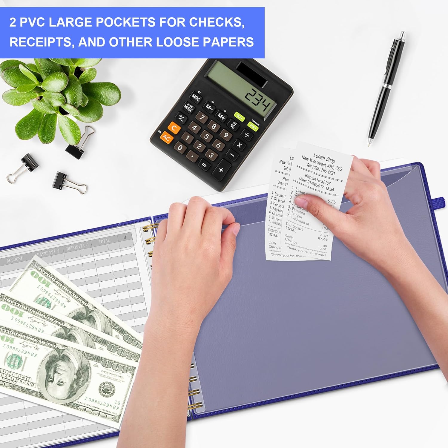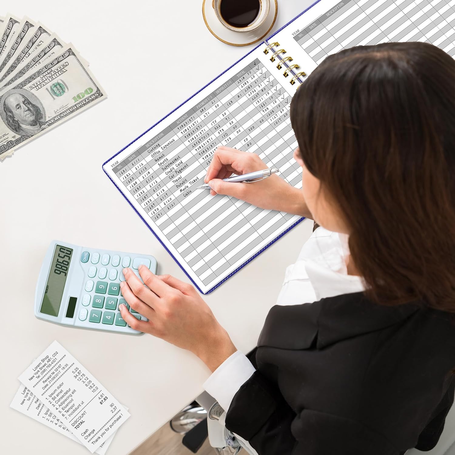 - Practical Design: The accounting book is PU leather hardcover, with double-wire spiral binding that allows it to lay flat 360°; 100gsm thick paper, comes with an elastic band, pen loop, bookmarks, and 2 large pockets for storing loose notes