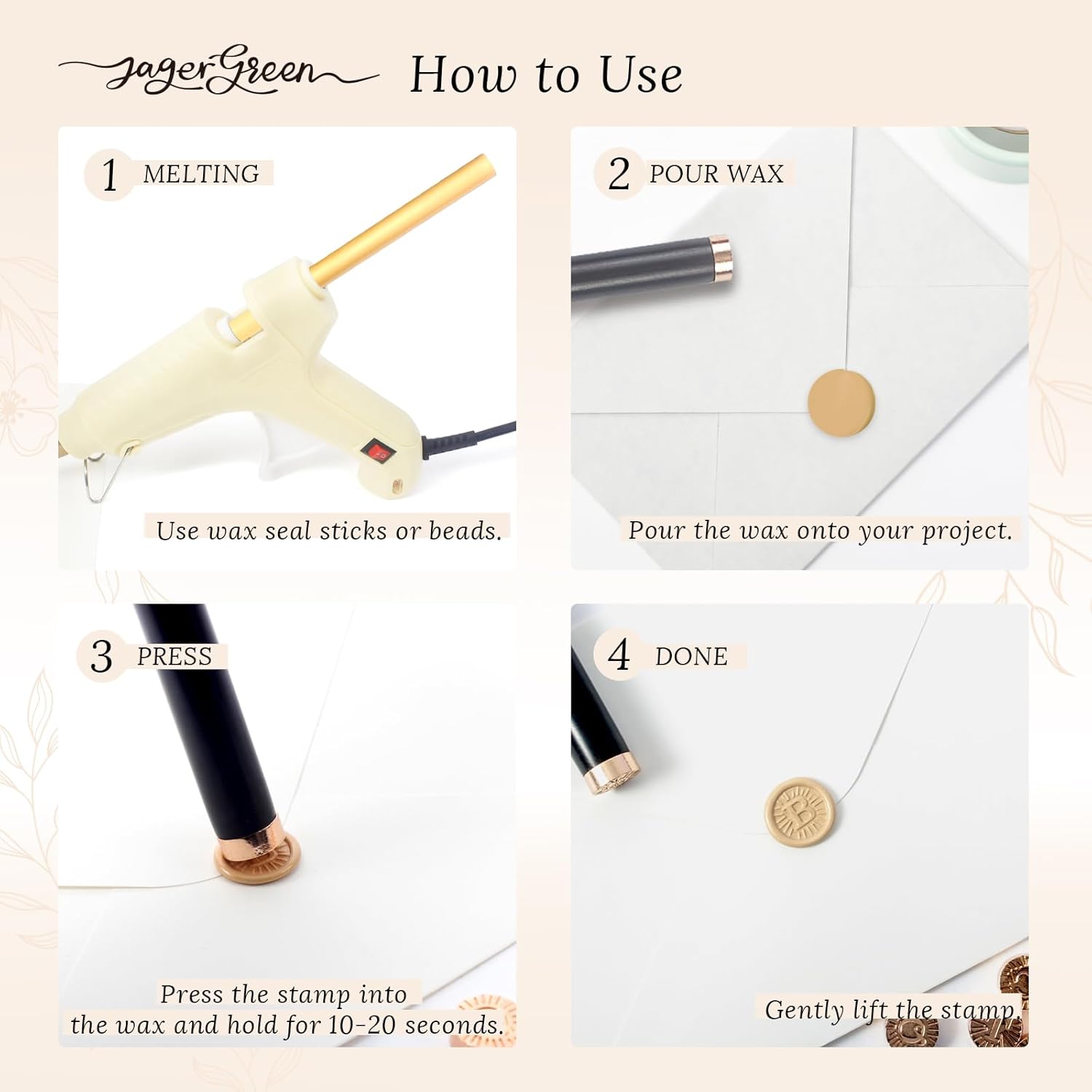- PREMIUM QUALITY: JagerGreen wax seal stamp is made of high quality wood handle and alloy head. The pattern is clear, smooth, and shiny, not easy to wear, ensuring a nice and clean seal with a lovely image. It can be used for a long time. The movable head is easy to install or replace with other seals.