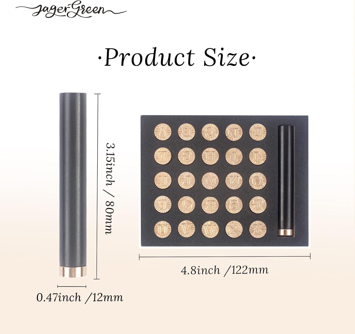 - PACKAGE INCLUDES: A set includes 26 pcs uppercase alphabet letters: A, B, C, D, E, F, G, H, I, J, K, L, M, N, O, P, Q, R, S, T, U, V, W, X, Y, Z with 1 wooden handle. The diameter of each wax seal stamp head is 0.47 inches (12 mm)