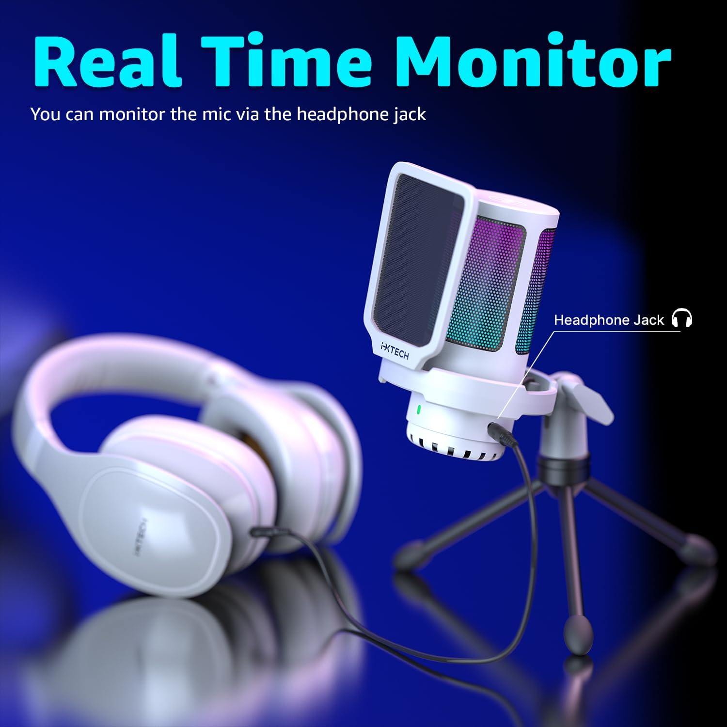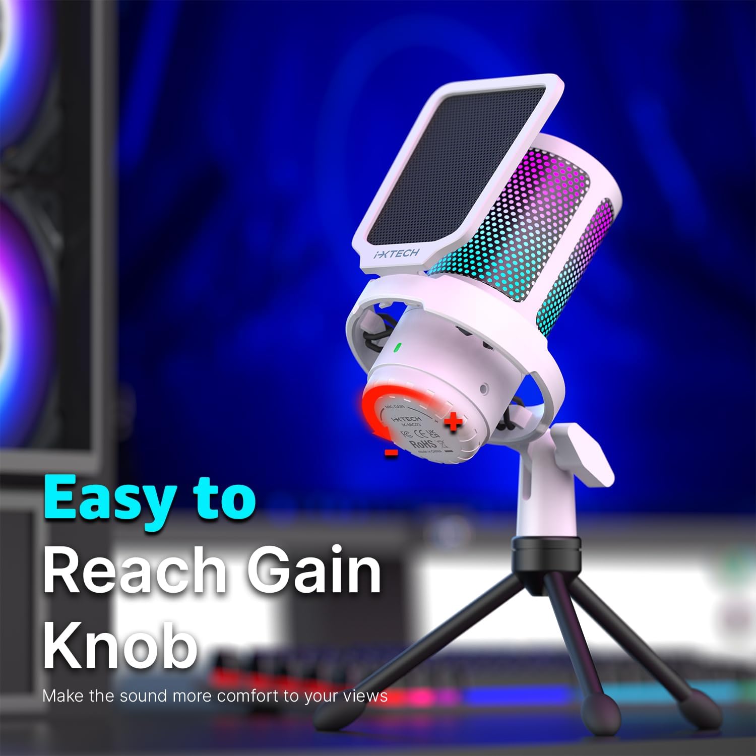 IXTECH USB Gaming Microphone for PC, RGB Condenser Microphone with Tripod Stand, Pop Filter, Rotate Gain Button, and Quick Mute, Noise Cancellation Computer Mic for Streaming, Gaming, Podcasting