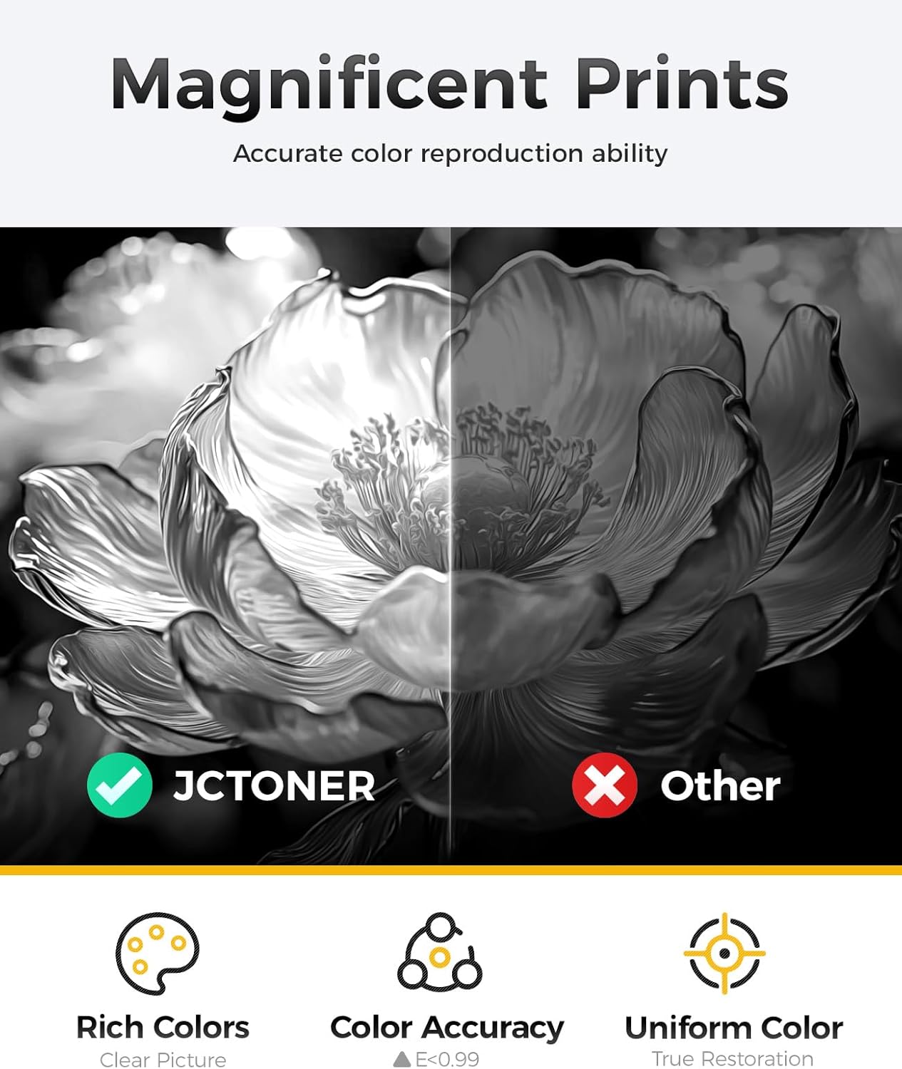 - The latest chip version: The JCTONER toner cartridges are equipped with the latest version of built-in chips, ensuring perfect compatibility between each toner cartridge and the printer. This enables you to print efficiently while maintaining stability and reliability, making installation convenient without the need for manual adjustments. All JCTONER toner cartridges have undergone strict quality testing and have obtained ISO9001 certification. High-quality toner cartridges can meet the demand for high printing volume. The fine toner ensures clear and stain-free printing results and extends the lifespan of the printer. You can purchase with confidence.