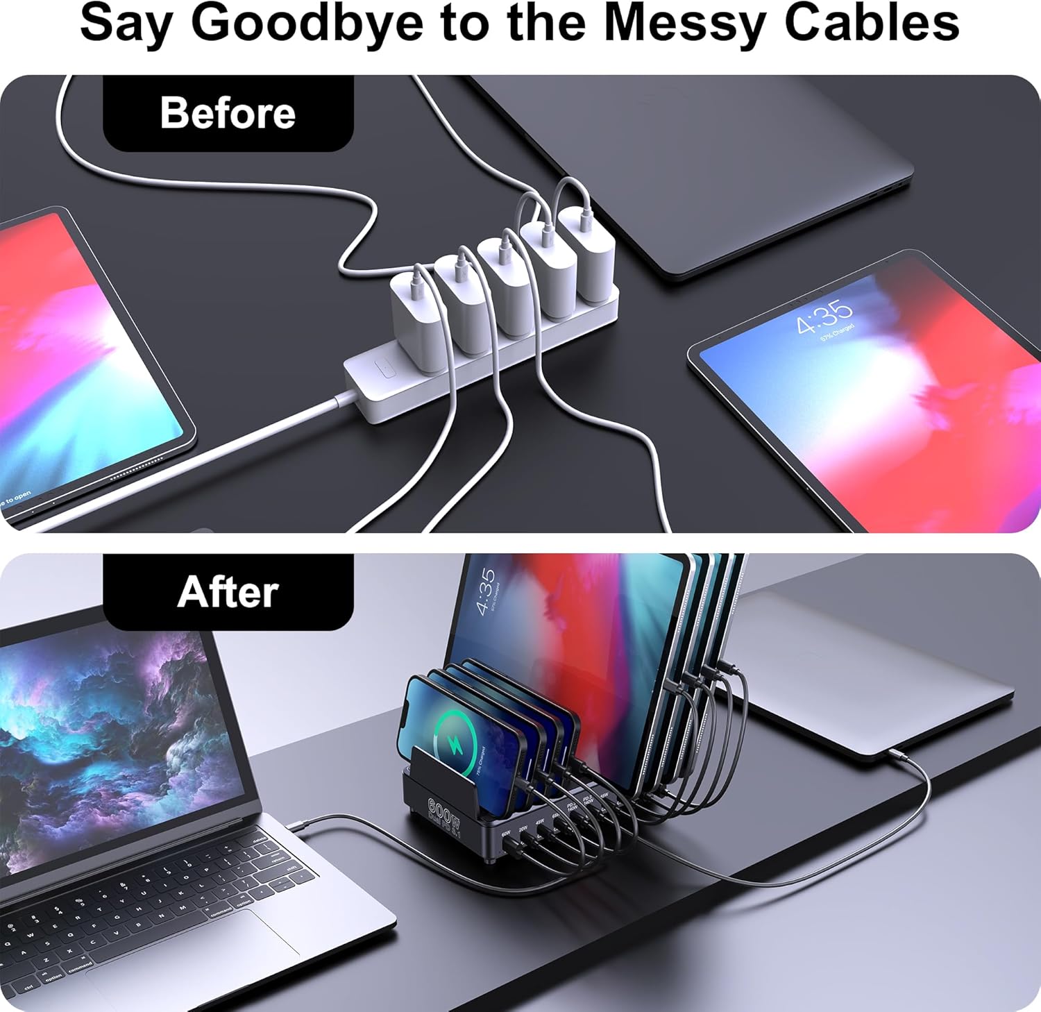 - 10 in 1 Charging Station: Our multi-device charging station features 8 USB-C ports and 2 USB-A ports to accommodate modern devices, and delivering a total output of up to 600W, fast charge up to 10 USB devices simultaneously. No more cluttered cables and do not need to plug a bunch of wall chargers on your power outlet, keeping your desk tidy and organized. (Note: The USB cables are NOT included in the package)