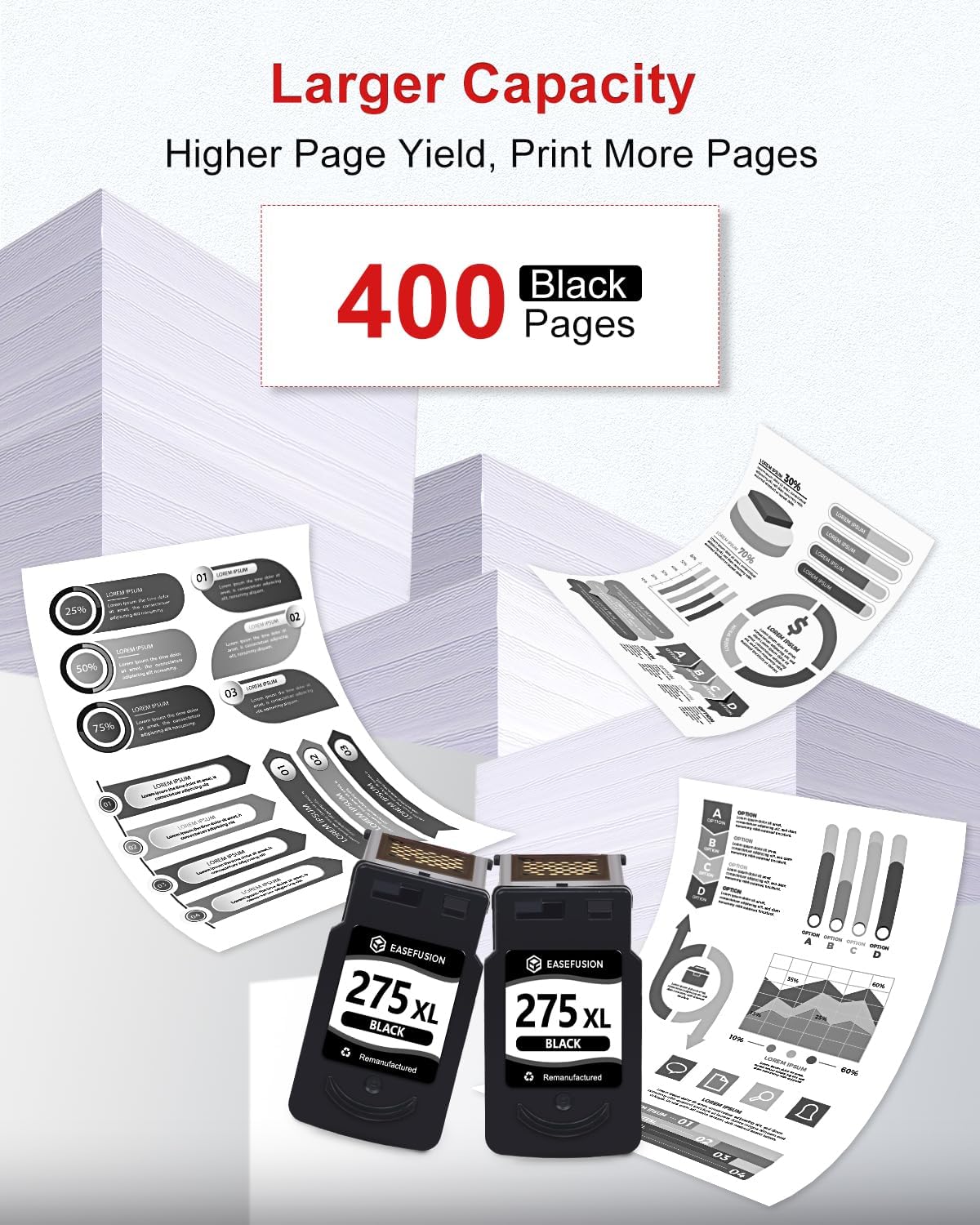 - Longer-lasting Prints: EaseFusion 275 ink cartridges for canon printers offers an impressive high page yield of at least 400 pages per for canon 275xl black ink cartridge (based on 5% coverage of A4 paper). Get more printing without the need for frequent cartridge replacements