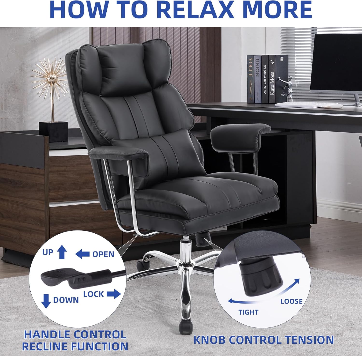 - ๐บ๐๐๐๐๐: Leather office chair built on a foundation of durability. Heavy-duty metal base and SGS-certified 4-Grade lift cylinder ensure not only steadfast executive chair stability but also peace of mind with big and tall office chair every adjustment.