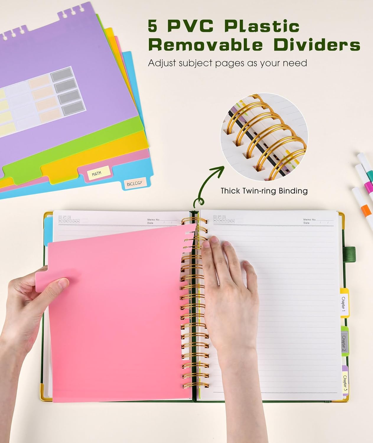 Hardcover Spiral Notebook journal with Removable Dividers Tabs, 300 Pages Leather 5 Subject Notebook College Ruled, 100GMS A5 Notebooks for Work School Note taking,Lined Journal for Women,A5-Green
