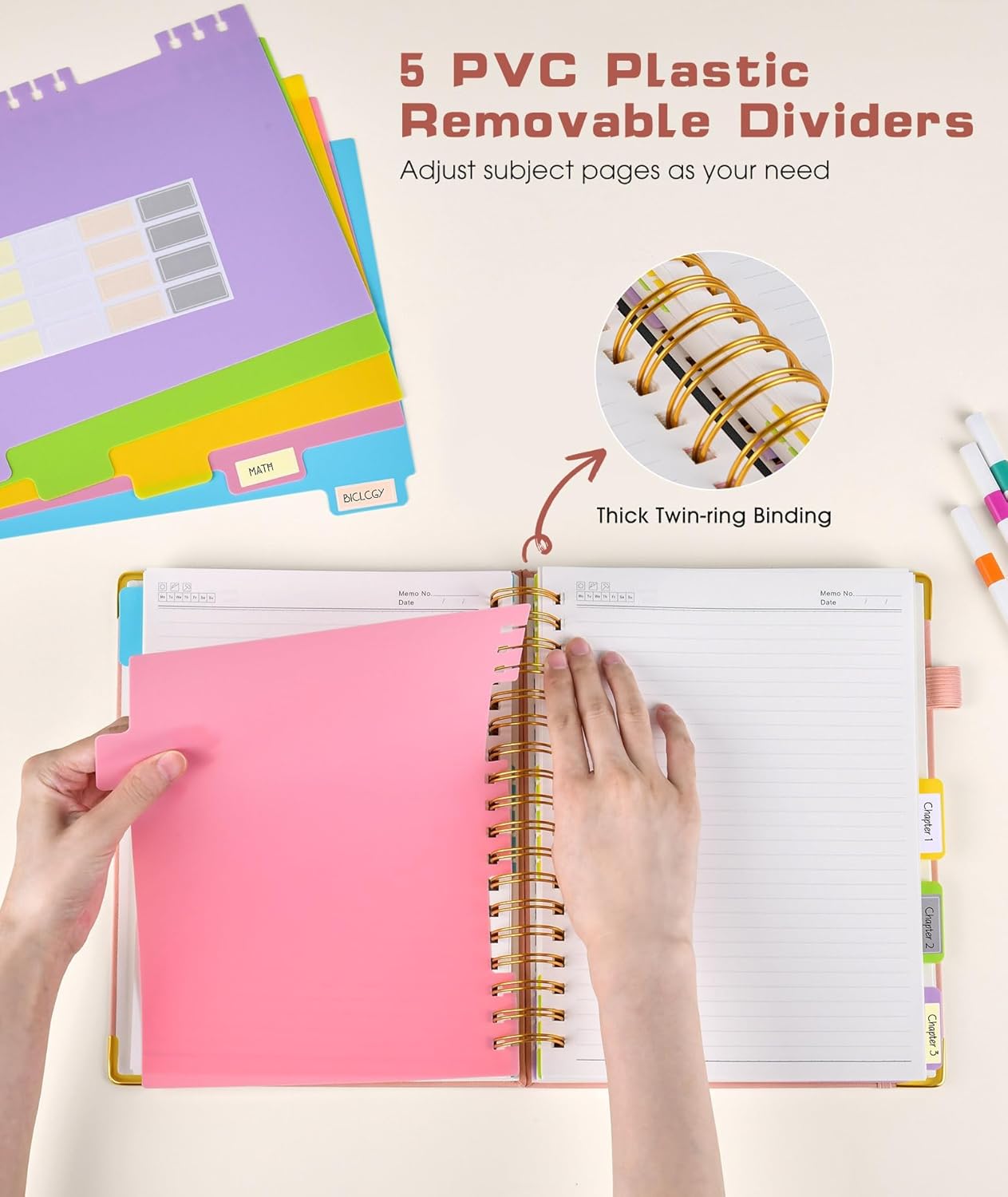 Hardcover Spiral Notebook journal with Removable Dividers Tabs, 300 Pages Leather 5 Subject Notebook College Ruled, 100GMS A5 Notebooks for Work School Note taking,Lined Journal for Women,A5-Pink
