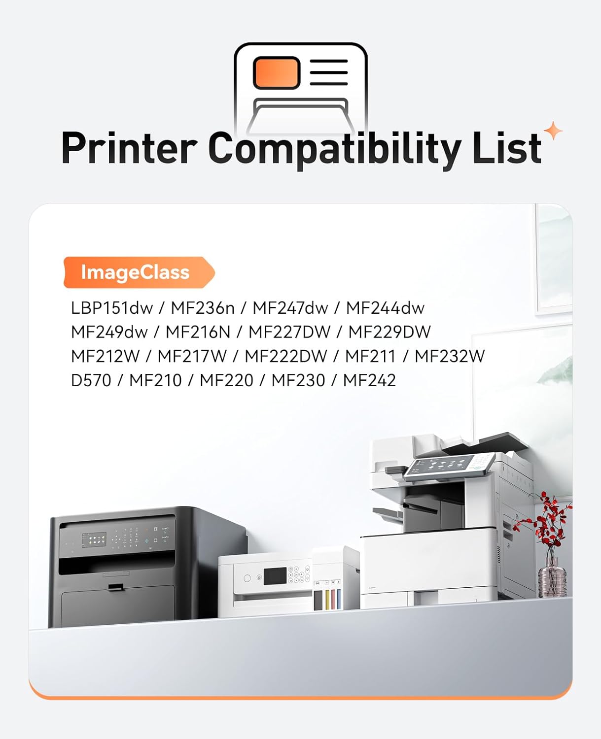 - Compatible Printers: Compatible with Canon ImageClass “MF”Series Printers:MF249dw,MF216n,MF227dw,MF247dw,MF236n,MF244dw,MF229dw,MF212w,MF217w,MF222dw,MF232w,MF242dw,MF210,MF211,MF220,MF230; Compatible with Canon ImageClass Laser Series Printers:D570,LBP151dw.