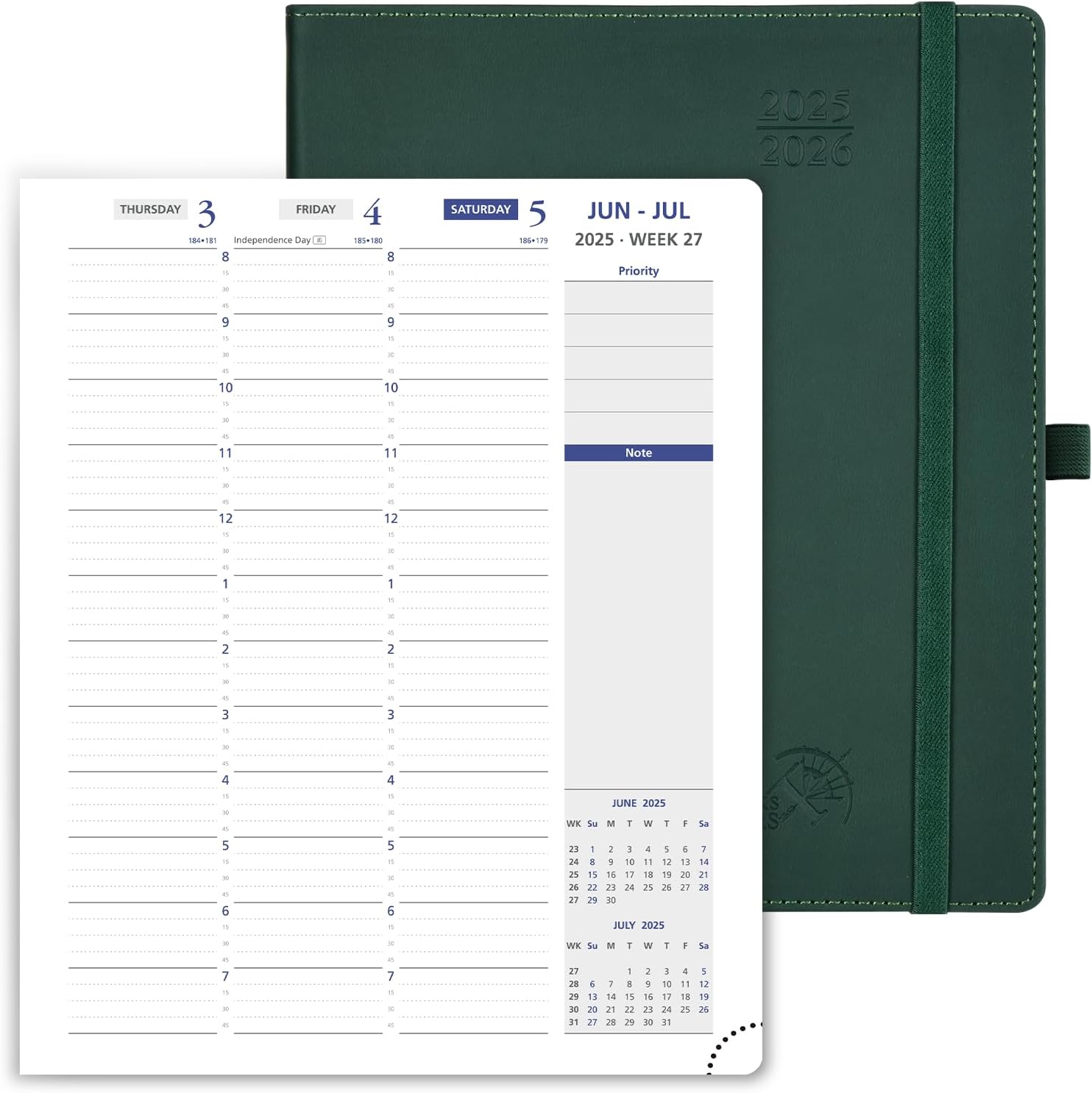 POPRUN Weekly Planner 2025-2026, 7.25'' x 8.5'', 15-Minute Hourly Appointment Book (July 2025-June 2026) with PU Leather Softcover, Monthly Tabs, Inner Pocket - Forest Green