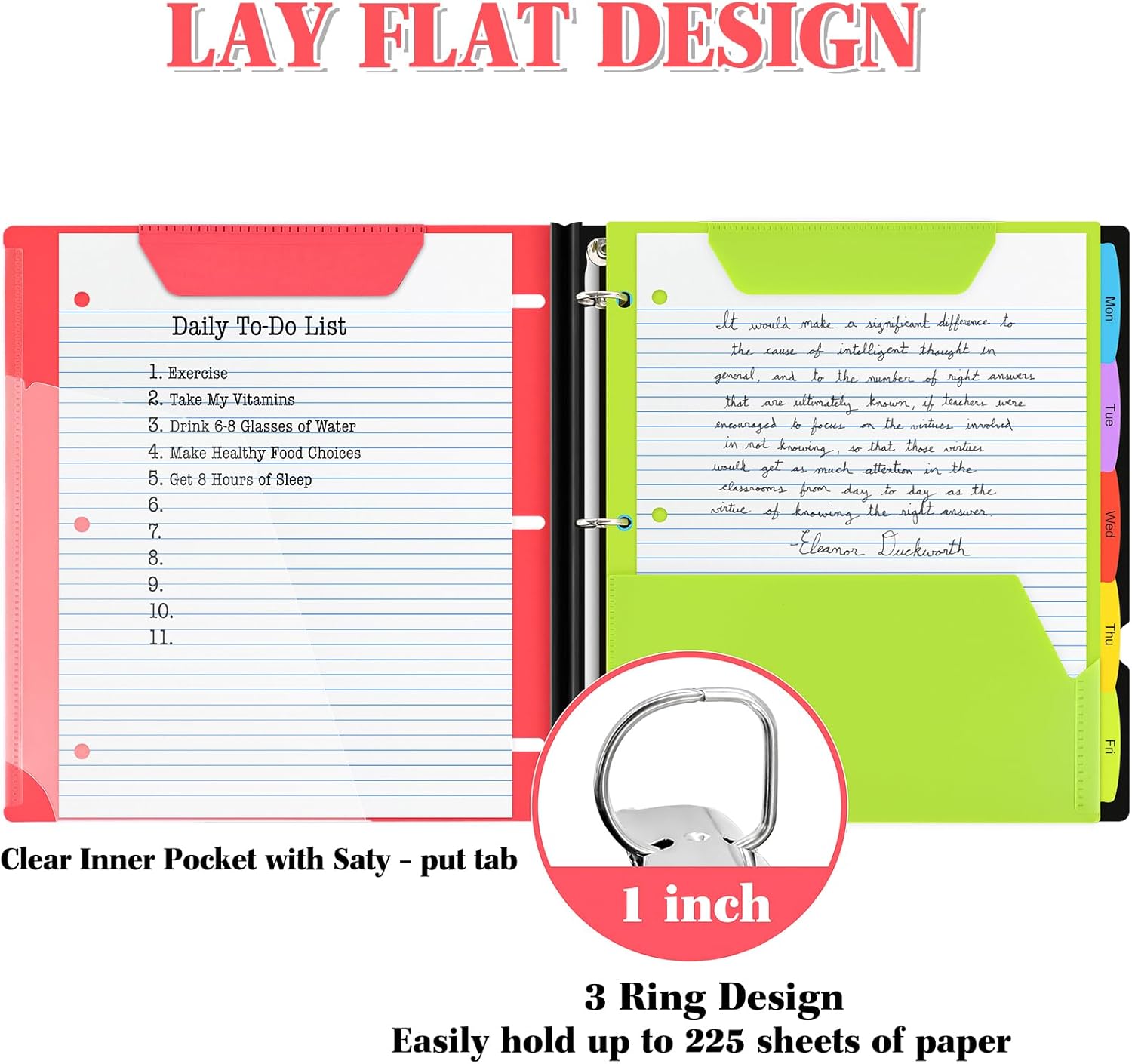 - Foldable Front Cover design : The INFUN Telescoping 3-Ring Binder features a foldable front cover design, allowing it to unfold fully and lie flat on the desktop, providing a smooth and level writing surface. Additionally, the foldable front cover can be conveniently folded back, saving valuable desktop space and serving as a temporary clipboard, offering a versatile workspace tailored to your needs.