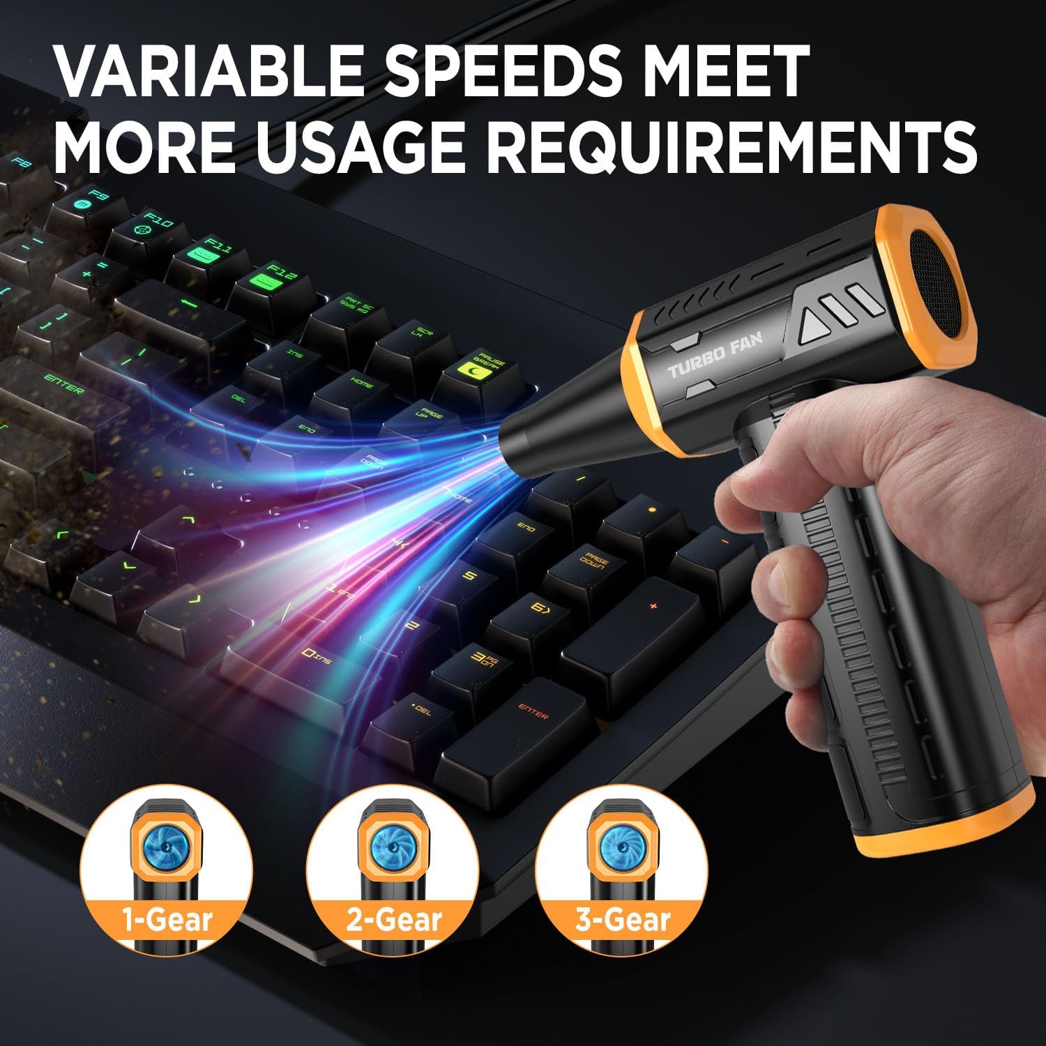 - 【Upgraded High-Capacity Battery & Fast Charging】 The rechargeable air dusters have built-in 10000mAh batteries, which provide enough power for long hours of use. These batteries are temperature, current, and short-circuit protected, so the fan air speed will not decrease even after prolonged use. At the same time, they support fast charging and have a Type-C connector, making them compatible with a variety of charging methods, including charging from a car or mobile power source.