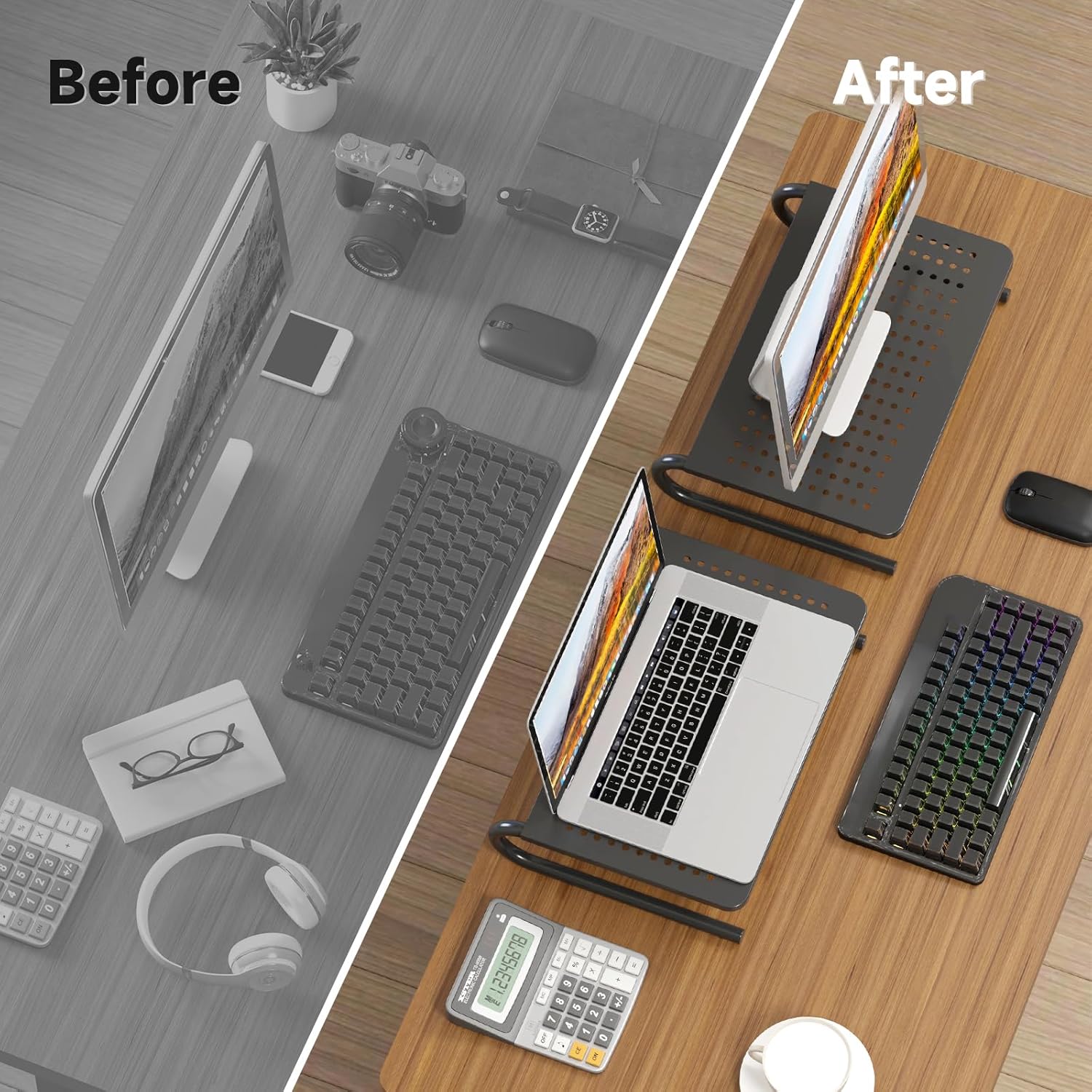 - Organization: sleek modern Black design complements any desk and the extra space underneath the platform for a neat surface