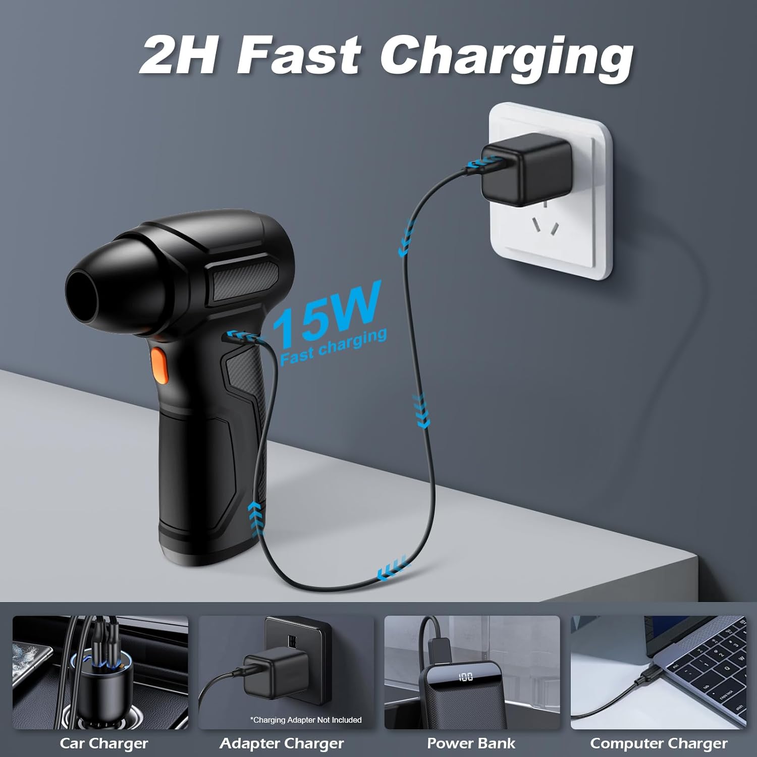 - 【2H Fast-Charging Electric Duster】Equipped with an 8000mAh rechargeable battery, this electric air duster supports fast charging in just 2 hours. Once fully charged, it provides extended usage time to handle multiple cleaning tasks with ease. The battery includes safety features like overcurrent, overvoltage, and temperature protection for worry-free use.