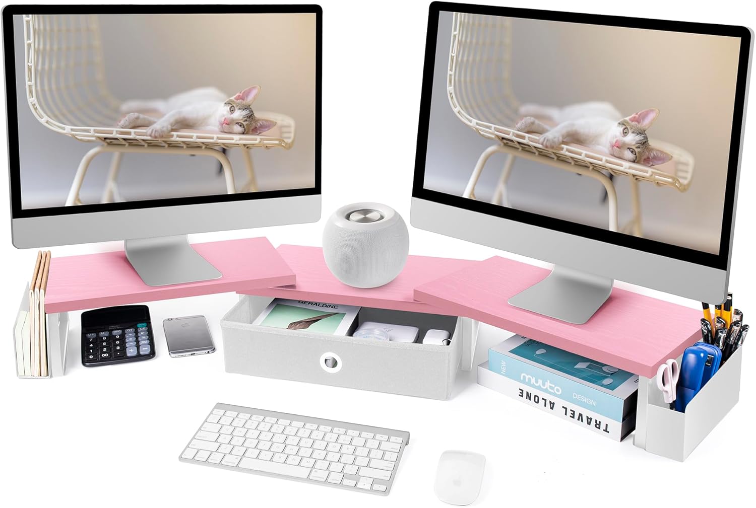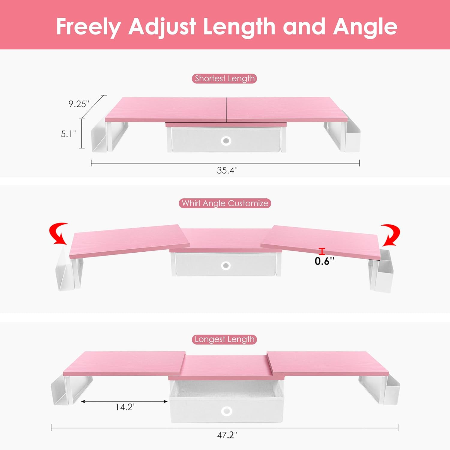 - 【Sturdy Computer Stand】Dual monitor riser with drawer is made of high quality MDF wood and solid steel legs. Desk shelf for monitor with metal feet can provide strong support and load-bearing. Non-slip rubber pads could prevent slipping or damage to your desk and it is a good desk organizer in pink for women.