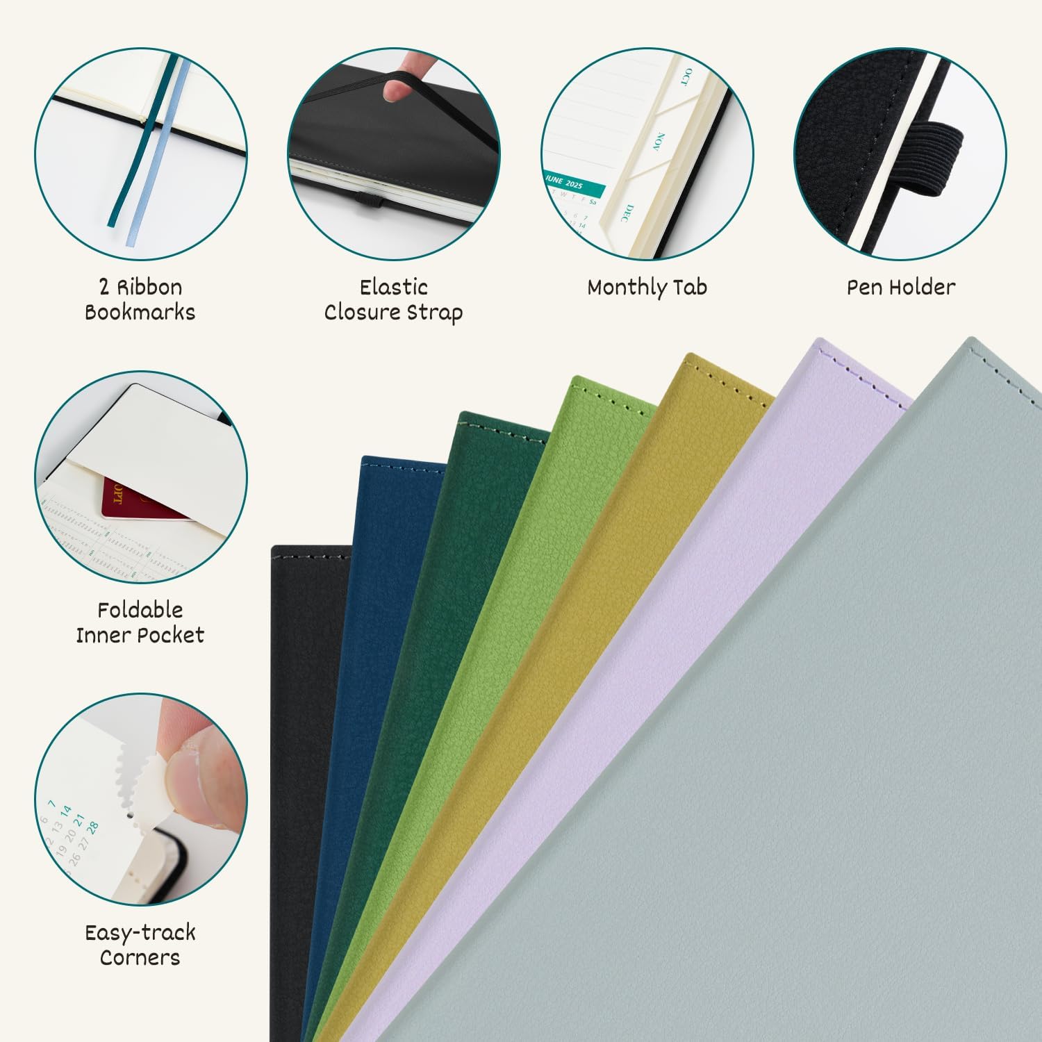- THOUGHTFUL DESIGN: 2 Ribbon Bookmarks | Easy-track Perforated Corners | Elastic Closure Strap | Inner Storage Pocket | Pen Loop | Date Countdown | Monthly Tabs