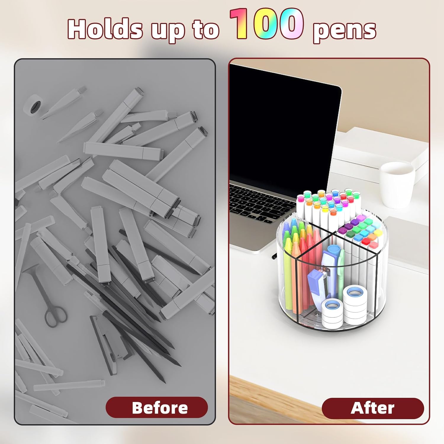 - 360 Degree Rotating Desktop Organizer -This organizer with 360 degree rotating designed, can not only organize pens and pencils, but also makeup brushes and lipsticks.This acrylic desk organizer making your tabletop look more advanced. Our pen organizers can be spins both sides, which is very convenient for storing pens and craft supplies, and it is easy to find and take the items we need by gently rotating it.