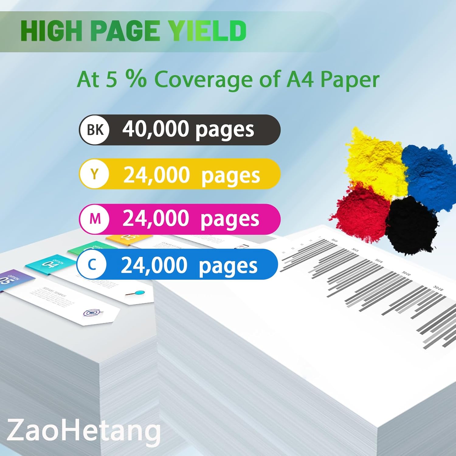 - Page yield: 40,000‬ pages per black, and 24,000 pages per color toner cartrdges 5% coverage